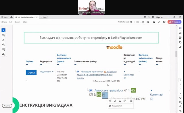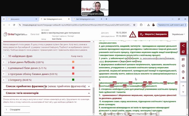 17 грудня о 13.00 (вівторок) на платформі Zoom відбувся вебінар від компанії StrikePlagiarism.com. Завданням системи є надання інформації, яка дозволяє ідентифікувати кількість запозичень в уже згадуваному тексті і їх джерелах.