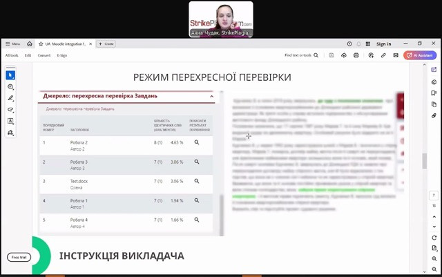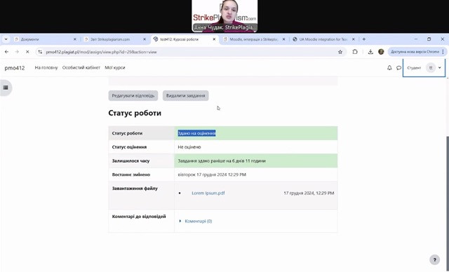 На вебінарі йшлося про завантаження роботи, формування звіту подібності, оцінювання та інтерпретацію звіту. Дізналися як створювати завдання, і використовувати систему через Moodle, створювати відгук-оцінювання з можливістю оцінки (самооцінки) з боку студентів, і як саме відбувається повторна перевірка на спеціальній кодовій панелі.
