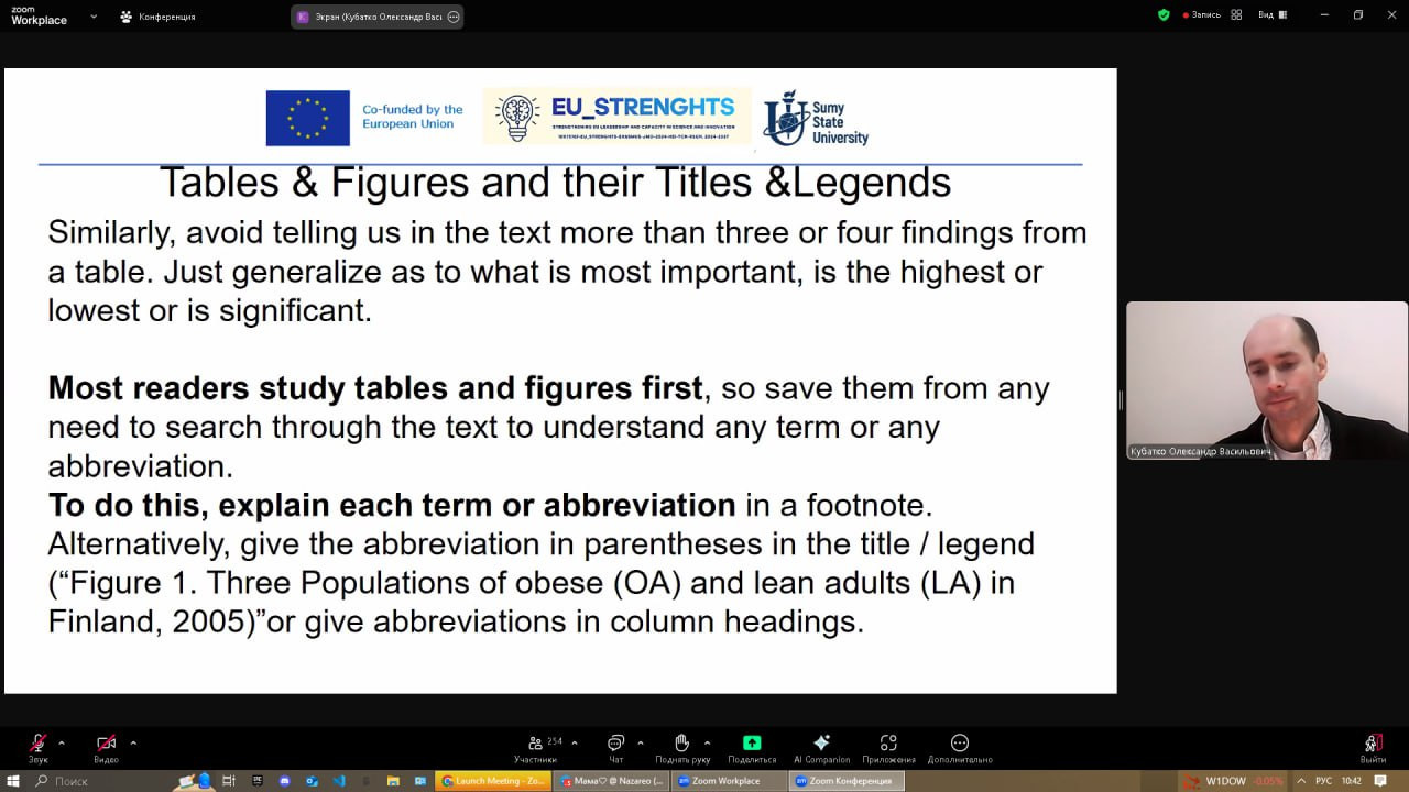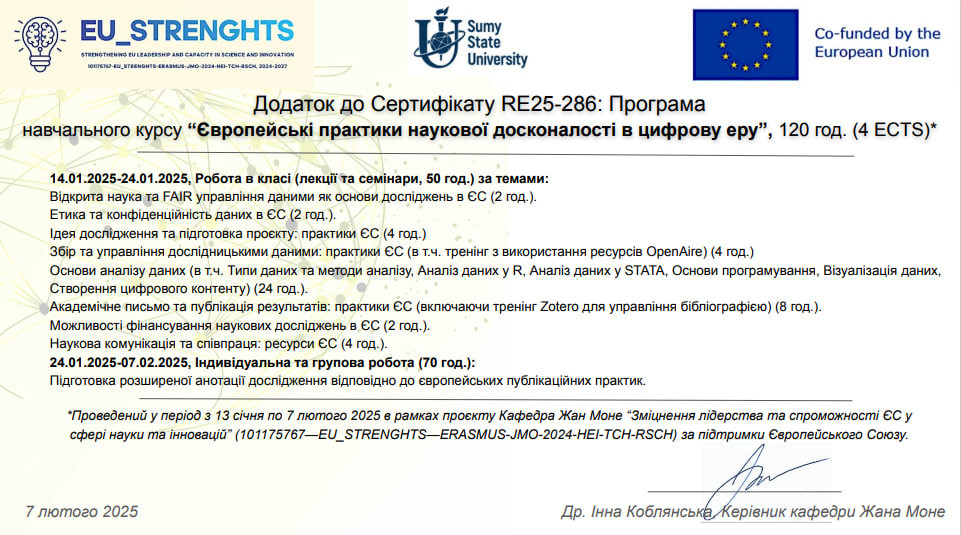 З 13 січня по 7 лютого 2025 року взято участь у курсі (4 ECTS), організованому в рамках проєкту Кафедра Жана Моне «Зміцнення лідерства та спроможності ЄС у сфері науки та інновацій» (101175767—EU_STRENGHTS—ERASMUS-JMO-2024-HEI-TCH-RSCH), що реалізується кафедрою економіки, підприємництва та бізнес-адміністрування Сумського державного університету під керівництвом к.е.н., доцента Інни Коблянської та фінансується Європейським Союзом. Під час курсу говорили про європейські підходи до відкритої науки та принципи FAIR-управління даними (Findable, Accessible, Interoperable, Reusable), що сприяє підвищенню прозорості та ефективності наукових досліджень; поглибили знання з етики наукових досліджень та конфіденційності даних, ознайомилися з європейськими вимогами щодо їхнього захисту та відповідального використання; опановували ключові методики підготовки наукових проєктів та написання грантових заявок відповідно до стандартів ЄС, що відкриває можливості для залучення міжнародного фінансування; отримали практичні навички роботи з дослідницькими даними – їх збору, управління та збереження, пройшли тренінги з використання сучасних цифрових інструментів, тощо. Програма курсу стала чудовою можливістю розширити компетентності в галузі сучасної науки, застосувати найкращі практики ЄС у власних дослідженнях. Розширення мережі професійних контактів сприятиме подальшій співпраці та реалізації спільних дослідницьких ініціатив. Висловлюю подяку організаторам за високий рівень змістовного наповнення курсу та відмінну організацію!