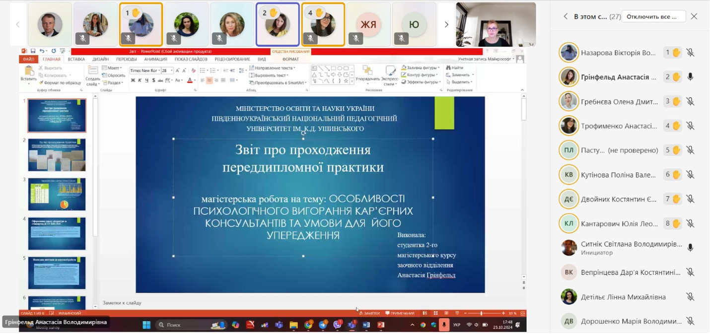 25 жовтня 2024 року на кафедрі теорії та методики практичної психології Університету Ушинського відбулася підсумкова конференція преддипломної практики для здобувачів 2 курсу ОПП «Практична психологія.