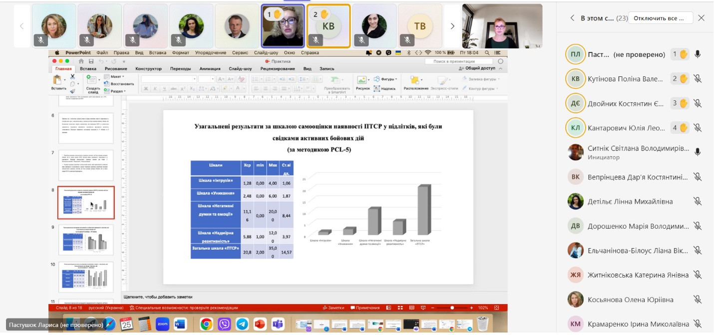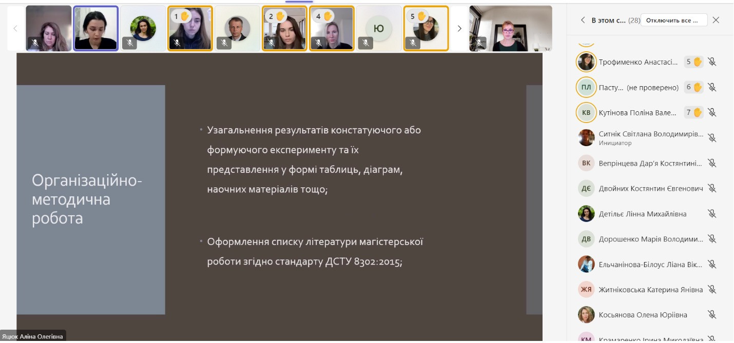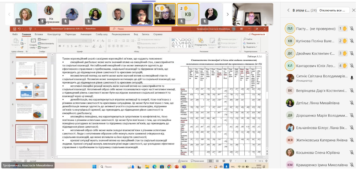 25 жовтня 2024 року на кафедрі теорії та методики практичної психології Університету Ушинського відбулася підсумкова конференція преддипломної практики для здобувачів 2 курсу ОПП «Практична психологія. Екстремальна та кризова психологія» за спеціальністю 053 Психологія (другий магістерський рівень вищої освіти, заочна форма навчання). Магістранти завершили переддипломну практику та сформували професійні компетентності, необхідні для психологічної діяльності. Вони набули навичок аналізу результатів емпіричних досліджень, їх узагальнення та представлення у наочній формі.