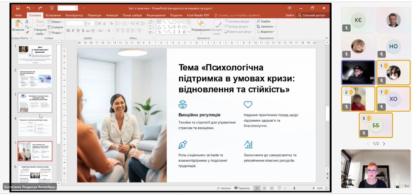 07 листопада 2024 року на кафедрі теорії та методики практичної психології Університету Ушинського відбулася підсумкова конференція виробничої (асистентської) практики для здобувачів 1 курсу ОПП "Практична психологія. Екстремальна та кризова психологія" за спеціальністю 053 Психологія (другий магістерський рівень вищої освіти, заочна форма навчання).