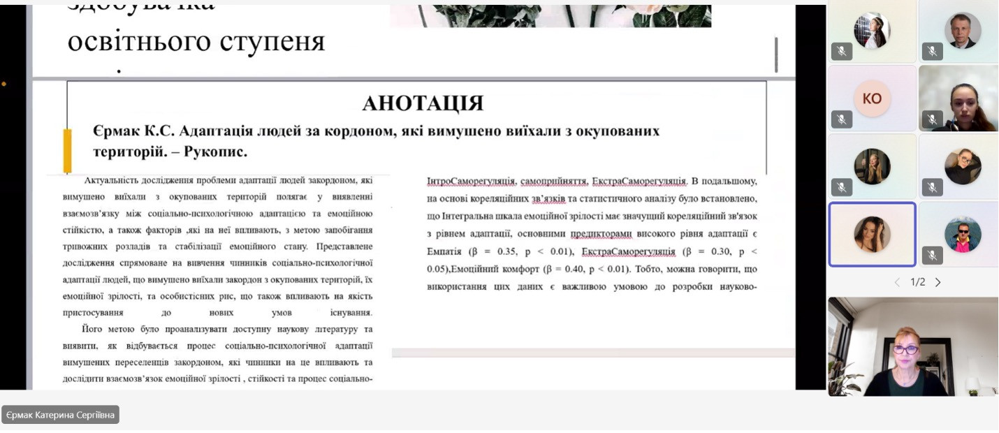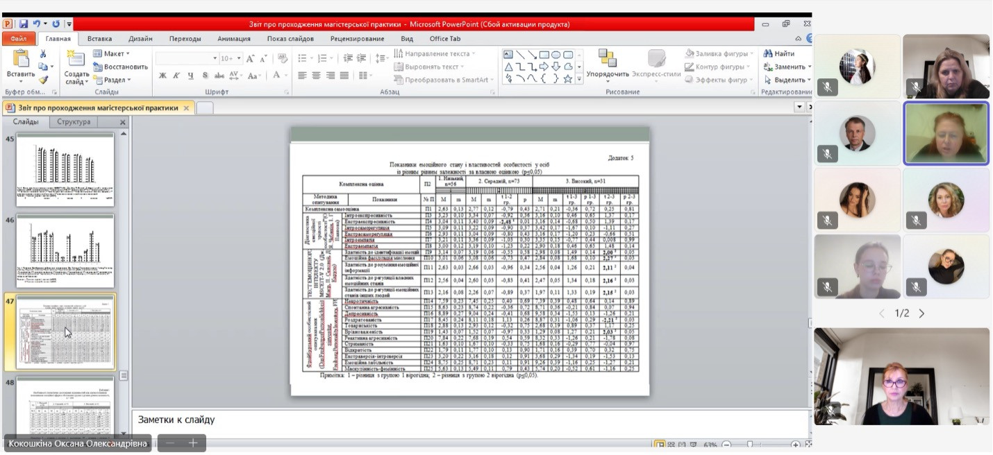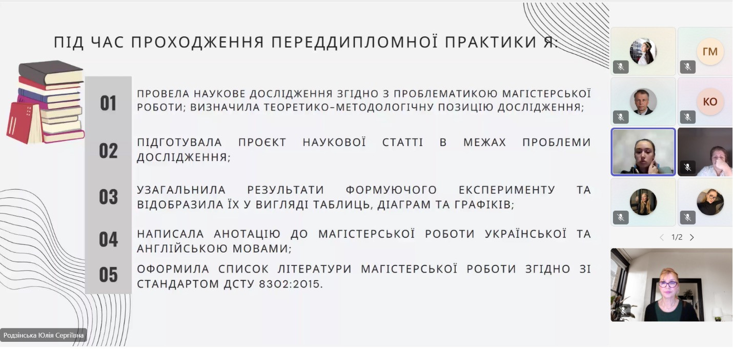 27 листопада 2024 року на кафедрі теорії та методики практичної психології Університету Ушинського відбулася підсумкова конференція преддипломної практики здобувачів 2 курсу ОПП "Практична психологія. Екстремальна та кризова психологія" за спеціальністю 053 Психологія (другий магістерський рівень вищої освіти, денна форма навчання). Упродовж практики магістранти закріпили професійні знання та розвинули компетентності, необхідні для майбутньої психологічної діяльності. Здобувачі набули досвіду в проведенні емпіричних досліджень, обробці отриманих результатів та їх узагальненні у вигляді таблиць, діаграм і наочних матеріалів. Особливу увагу було приділено роботі з науковими джерелами, визначенню теоретико-методологічної основи власних досліджень і підготовці психолого-аналітичних матеріалів. Магістранти вдосконалили вміння складати психологічні висновки, підготували проєкти наукових статей та анотації до магістерських робіт, продемонструвавши готовність до аналізу та інтерпретації результатів дослідження.
