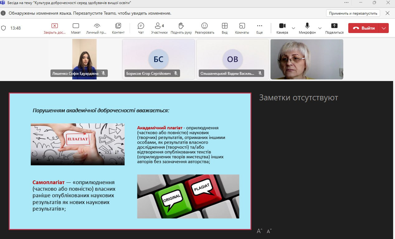19 березня 2025 року у межах Тижня доброчесності в Університеті Ушинського зі студентами першого року навчання першого (бакалаврського) рівня вищої освіти спеціальності 052 Політологія проведено тематичну бесіду на тему «Культура доброчесності серед здобувачів вищої освіти».