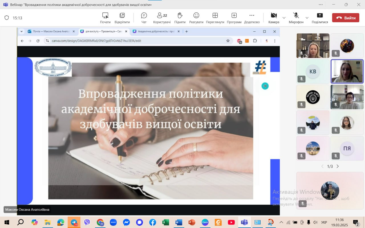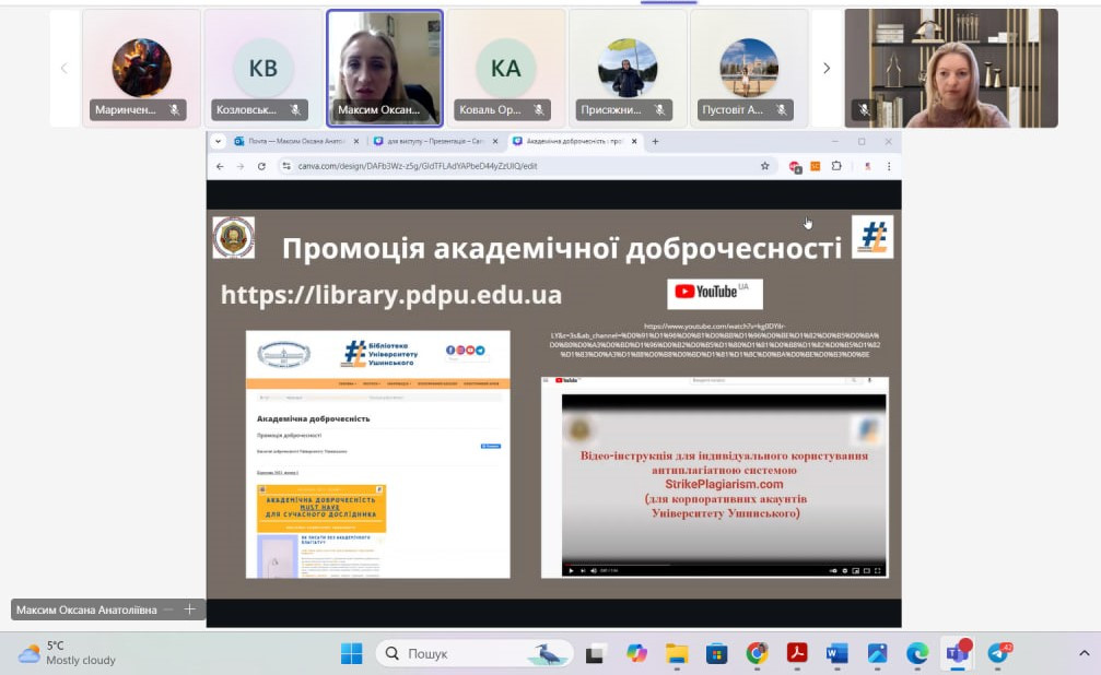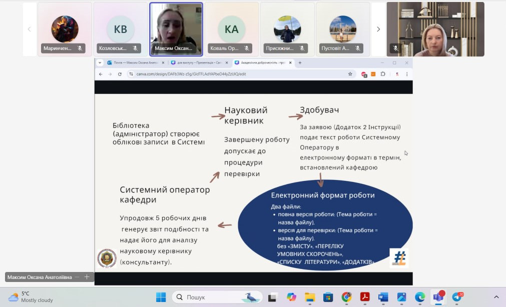 Максим О. А., директорка бібліотеки, презентувала інформацію учасникам вебінару про основні принципи академічної доброчесності, її значення у науковій та освітній діяльності, а також ключові види порушень: плагіат, самоплагіат, фабрикацію та фальсифікацію даних, академічний обман і неправомірна допомога під час виконання завдань.