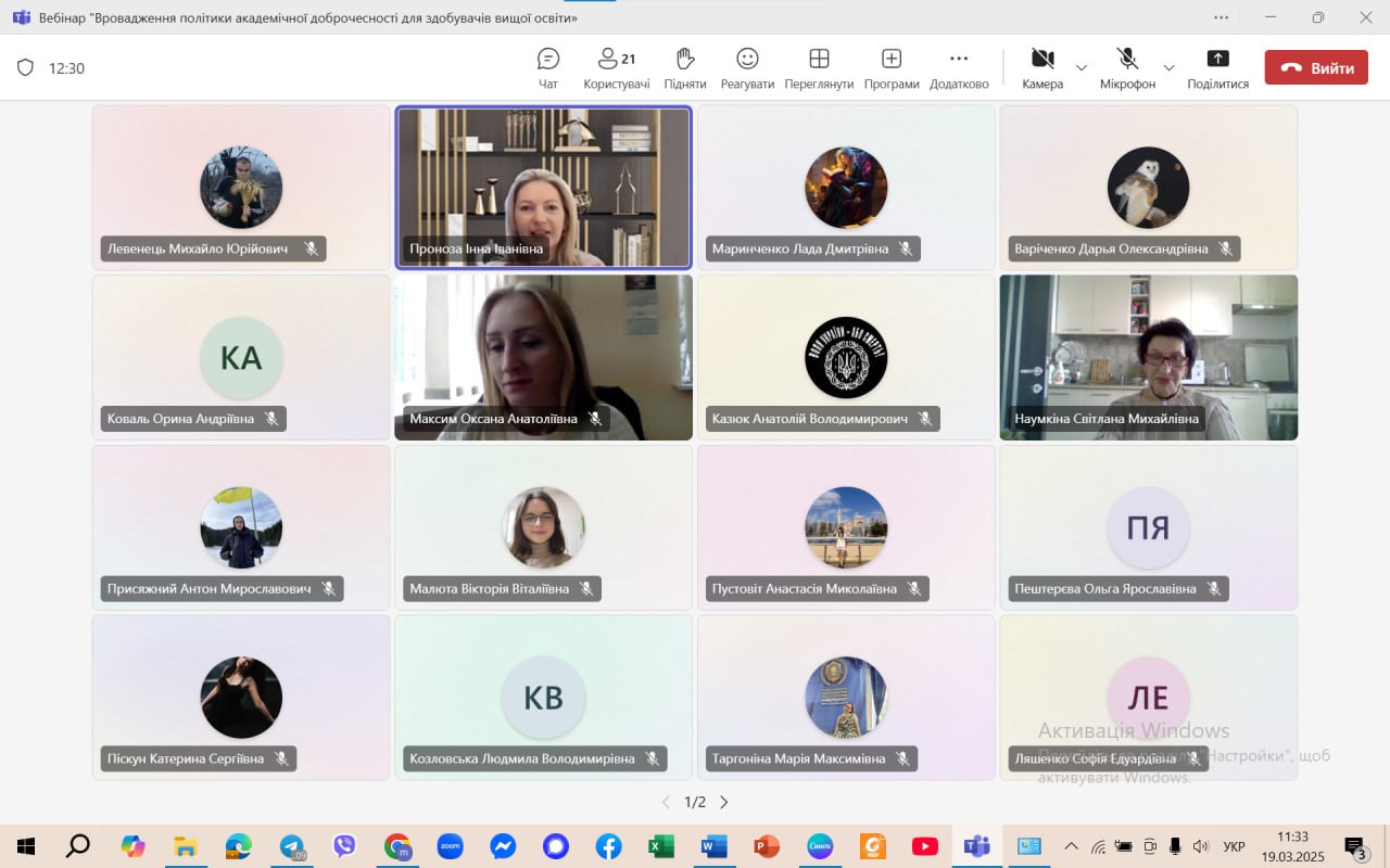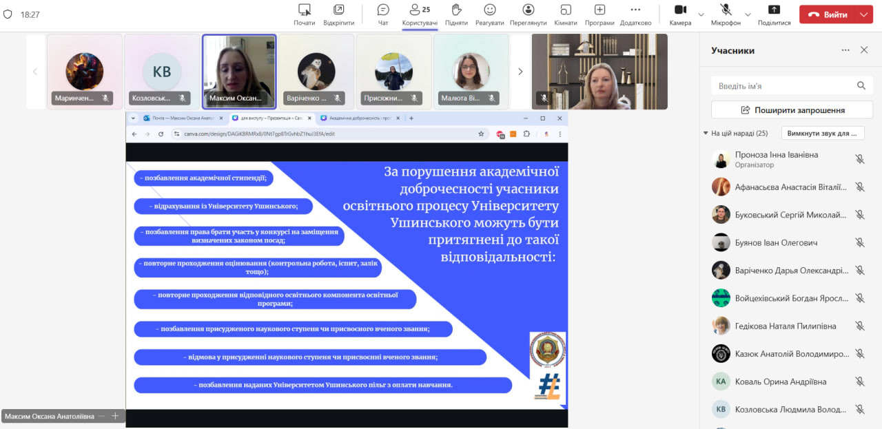 У межах Тижня доброчесності в Університеті Ушинського, що триває з 17 по 21 березня 2025 року, 19 березня відбувся вебінар «Впровадження політики академічної доброчесності для здобувачів вищої освіти».