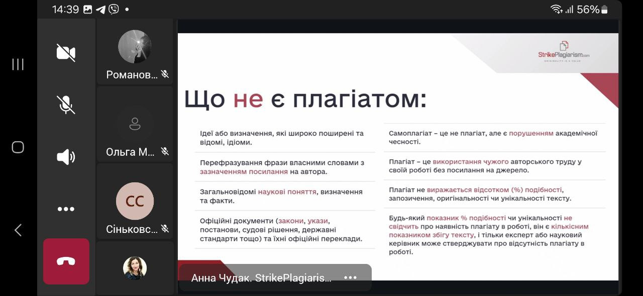 19 березня 2025 року науково-педагогічні працівники, здобувачі першого (бакалаврського) рівня вищої освіти спеціальності 028 «Менеджмент соціокультурної діяльності», здобувачі третього (освітньо-наукового) рівня вищої освіти спеціальності 033 «Філософія» долучилися до вебінару «Перевірка на плагіат як інструмент академічної доброчесності: аналіз звіту подібності + КП ШІ у StrikePlagiarism.com». Захід відбувся в межах «Тижня доброчесності в Університеті Ушинського». Захід розпочався з вітального слова Оксани Максим, директорки бібліотеки, Голови Групи сприяння доброчесності в Університеті Ушинського, яка наголосила на важливості академічної доброчесності в освітньому процесі. Спікерка – Анна ЧУДАК, менеджер з розвитку plagiat.pl (https://plagiat.pl/) в Україні. Учасники отримали практичні навички роботи із системою StrikePlagiarism.com, роз’яснення щодо оцінки текстів на плагіат та використання штучного інтелекту для перевірки доброчесності робіт. Дискусія підкреслила важливість таких заходів для формування культури доброчесності серед здобувачів вищої освіти. Активну участь в обговоренні теми взяла Інна Федорова, аспірантка 3-го року навчання. Академічна доброчесність – основа якісної освіти та наукової діяльності!