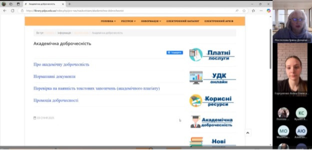 Особливу увагу було приділено практичному аспекту дотримання академічної доброчесності: студенти отримали інформацію про ресурси, доступні на сайті бібліотеки Університету Ушинського, серед яких — нормативні документи, інструменти перевірки на академічний плагіат, інформаційні матеріали з промоції доброчесності.