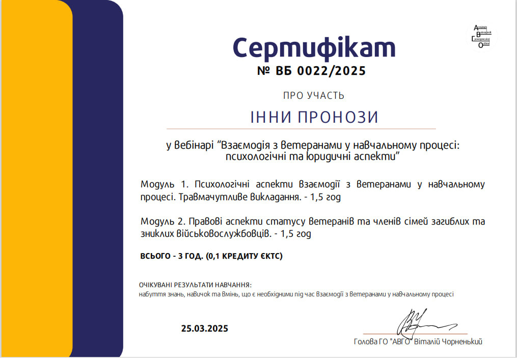 І етап академічної мобільності в межах міжнародного проєкту IFES за програмою «Democracy: from theory to practice» триває. Проф. Оксана Петінова та доц. Інна Проноза взяли участь у вебінарі «Взаємодія з ветеранами у навчальному процесі: психологічні та юридичні аспекти». Актуальність заходу полягає в необхідності формування інклюзивного, психологічно безпечного та правово обґрунтованого освітнього середовища для ветеранів, які повертаються до навчання. Опрацьовано модулі «Психологічні аспекти взаємодії з ветеранами у навчальному процесі. Травмачутливе викладання» та «Правові аспекти статусу ветеранів та членів сімей загиблих і зниклих військовослужбовців». Отримані знання сприятимуть створенню інклюзивного освітнього простору, чутливого до потреб студентів із досвідом військової служби. Інклюзія у вищій освіті — це конкретна практика реалізації демократичних цінностей, де кожен має право на освіту без дискримінації. Вебінар піднімає питання адаптації освітнього середовища для ветеранів, що є прикладом практичного втілення демократичного ідеалу – освіти для всіх.