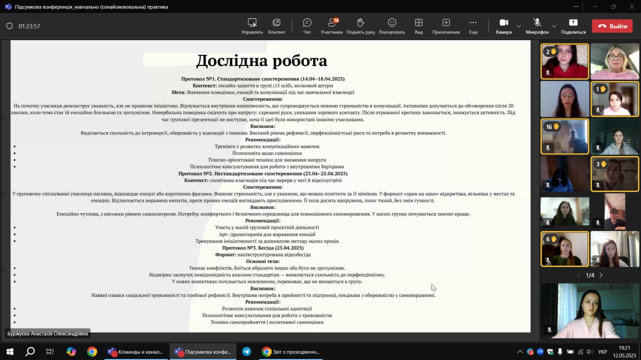 11 травня 2025 року на кафедрі теорії та методики практичної психології пройшла підсумкова конференція з навчальної (ознайомлювальної) практики здобувачів першого (бакалаврського) рівня вищої освіти другого курсу за освітньо-професійною програмою «Психологія» зі спеціальності 053 Психологія денної форми навчання.