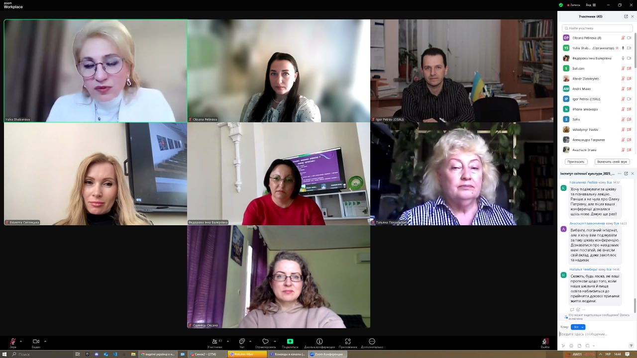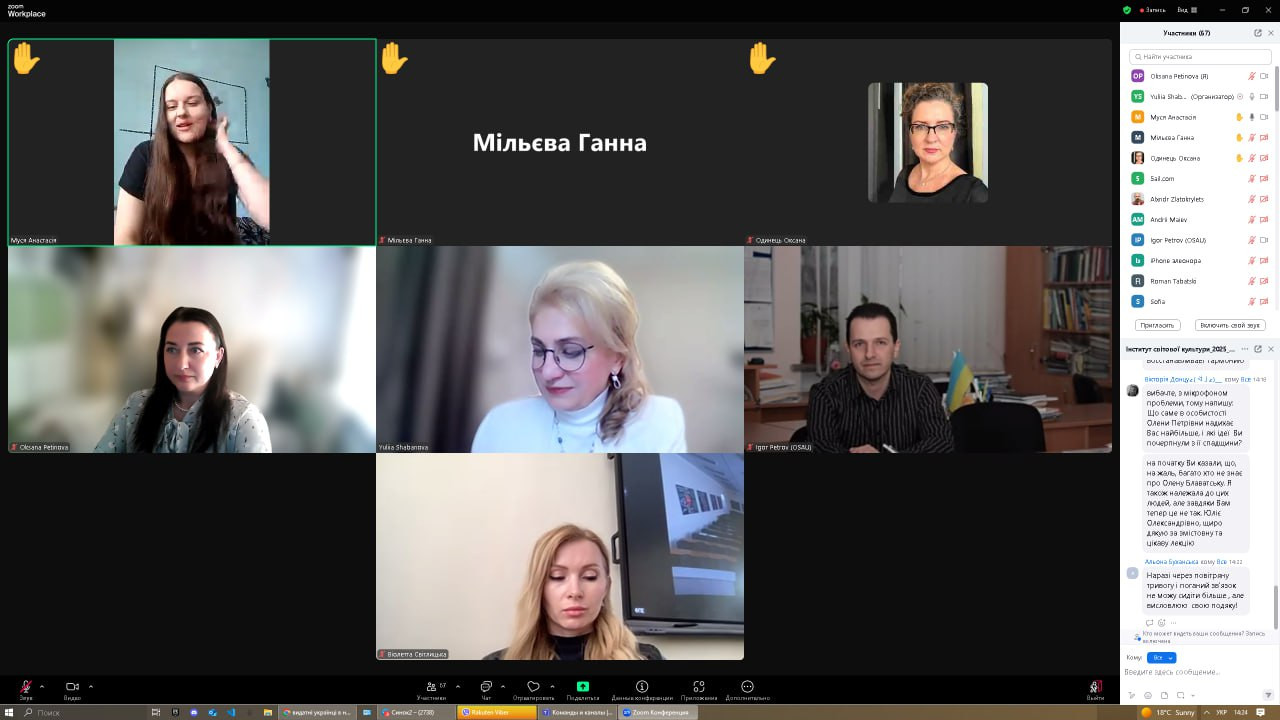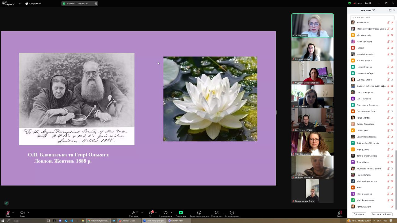 8 квітня 2025 року науково-педагогічні працівники кафедри, аспіранти, студенти спеціальності 028 «Менеджмент соціокультурної діяльності» та 013 «Початкова освіта» долучилися до онлайн-зустрічі, що була проведена у межах програми «Гостьовий лектор» на запрошення доц. Тетяни Поплавської, і присвячена визначній постаті світової духовної культури – Олені Блаватській.Спікер – д. філос. н., професор, директор Науково-дослідницького центру «Інститут світової культури» Дніпровської академії музики Юлія Шабанова. Захід зібрав понад 100 учасників, охочих долучитися до розуміння філософської спадщини однієї з найвпливовіших жінок ХІХ століття. Під час зустрічі ознайомилися з ключовими працями, основними ідеями філософських концепцій, віртуально відвідали музей, присвячений її життю і творчості. Захід приурочено до Дня Білого Лотоса – дати, яка щорічно відзначається вшануванням пам’яті Олени Петрівни, як символа духовного просвітлення, гуманізму та пошуку істини. Окремо хочеться відзначити учасників студентського наукового гуртка «Південноукраїнські наукові студії» (керівник — проф. Оксана Петінова). Юліана Варшавська, Муся Анастасія та Вікторія Діденко не лише взяли активну участь у жвавій дискусії, але й поділилися власними аналітичними міркуваннями. Як визнання їхнього інтелектуального внеску, Юлія Олександрівна надіслала студенткам свої авторські монографії «Теософія: історія та сучасність», які було урочисто вручено. Аспіранти ОНП «Філософія» активно розмірковували щодо карми, духовного розвитку, хронік Акаші, цікавилися проблематикою зустрічей теософського товариства, членами якого є Юлія Олександрівна та Тетяна Миколаївна. Серед найбільш активних – Інна Федорова, Віолета Світлицька та Людмила Городнюк. З нагоди свята бібліотеці кафедри презентовано наукові та навчально-методичні праці, які займуть чинне місце серед літератури сучасних науковців у нашій колекції. Щиро дякуємо за надзвичайні враження, змістовну лекцію та атмосферу інтелектуального збагачення. Такі події надихають на глибші пошуки, відкривають нові горизонти та залишають у серці світло.