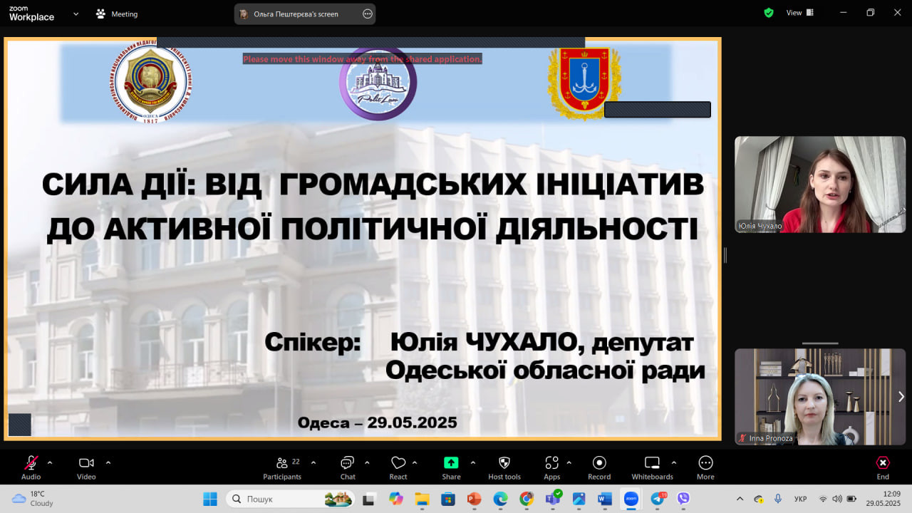29 травня 2025 року в межах програми «Гостьовий лектор» для здобувачів усіх рівнів спеціальності С2 Політологія відбувся онлайн-практикум із професіоналом-практиком, стейкхолдером освітніх програм — Юлією ЧУХАЛО, депутаткою Одеської обласної ради, керівницею депутатської групи жінок «Рівні можливості», заступницею голови комісії з питань охорони здоров’я та соціальної політики.