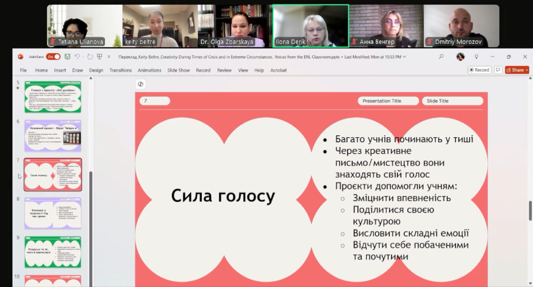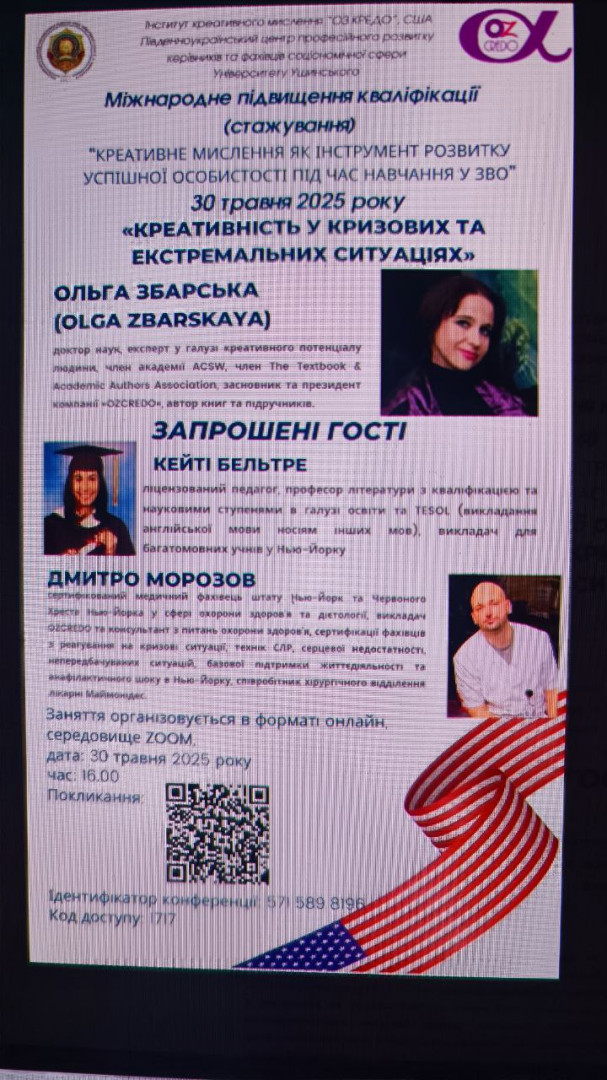 Викладачі кафедри загальної та диференціальної психології, аспіранти, здобувачі другого (магістерського) рівня вищої освіти зі спеціальності 053 Психологія ОПП «Прикладна і практична психологія» Університету Ушинського взяли участь у заході «Креативність у кризових та екстремальних ситуаціях», що був організований Інститутом креативного мислення «ОЗ КРЕДО»,(США); Південноукраїнським центром професійного розвитку керівників та фахівців соціономічної сфери Університету Ушинського.