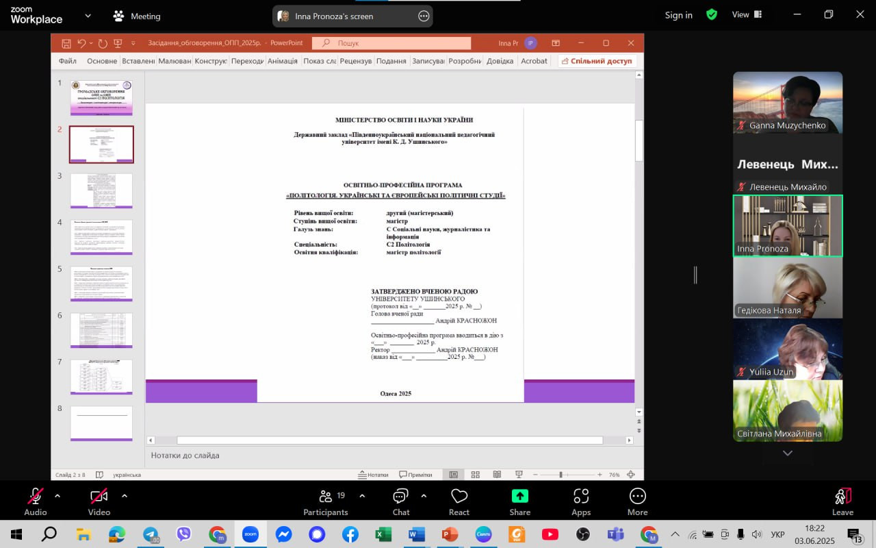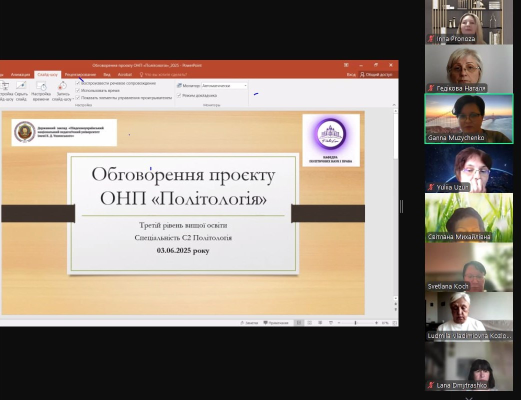 03 червня 2025 року на розширеному засіданні кафедри політичних наук і права Університету Ушинського відбувся заключний етап громадського обговорення проєктів освітніх програм підготовки здобувачів вищої освіти усіх рівнів спеціальності С2 Політологія: