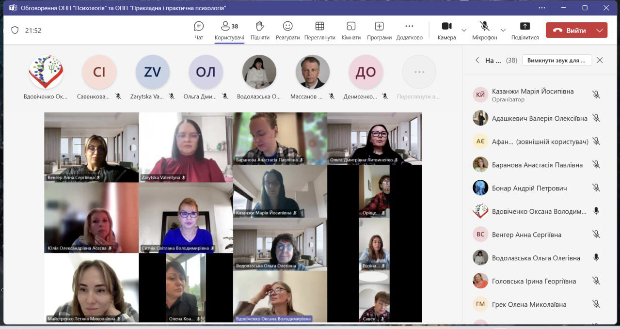 До зустрічі доєдналися стейкголдери Юлія АСЄЄВА (доктор психологічних наук, професор, академік НАН ВО України, завідувач кафедри мовної та психолого-педагогічної підготовки, Одеський національний економічний університет); Наталя АФАНАСЬЄВА (доктор психологічних наук, професор, професор кафедри психології і соціології, Харківський національний економічний університет імені Семена Кузнеця); Валентина ЗАРИЦЬКА (доктор психологічних наук, професор, завідувач кафедри практичної психології, Класичний приватний університет); Олена КВАС (доктор педагогічних наук, професор, декан філософського факультету, Львівський національний університет імені Івана Франка); Ольга ЛИТВИНЕНКО (доктор психологічних наук, професор, професор кафедри менеджменту охорони здоров’я, Одеський національний медичний університет, майстер-тренер, психотерапевт, член ради директорів WAPP, головний редактор журналу «The Global Psychotherapist»); Каріна ФОМЕНКО (доктор психологічних наук, професор, професор кафедри психології, Харківський національний педагогічний університет імені Г. С.Сковороди); Антоніна КІЧУК (доктор психологічних наук, професор, професор кафедри загальної та практичної психології, Ізмаїльський державний гуманітарний університет); Лариса ЖУРАВЛЬОВА (доктор психологічних наук, професор, професор кафедри психології, Поліський національний університет); Крістіна ТАМБОВСЬКА (кандидат педагогічних наук, директор, Одеський ліцей №84 Одеської міської ради); Альона ТАРАСЕНКО (начальник відділу організаційно-кадрового та навчально-методичного забезпечення Одеського технологічного університету ШАГ, психолог-консультант БФ ХЕСЕД ШААРЕЙ ЦІОН БЛАГОДІЙНИЙ ФОНД, психолог-волонтер Єврейський центр «Beit-Grand»); Ольга ТКАЧЕНКО (директор, Комунальна установа «Інклюзивно-ресурсний центр» Фонтанської сільської ради Одеського району Одеської області) та інші зацікавлені особи.