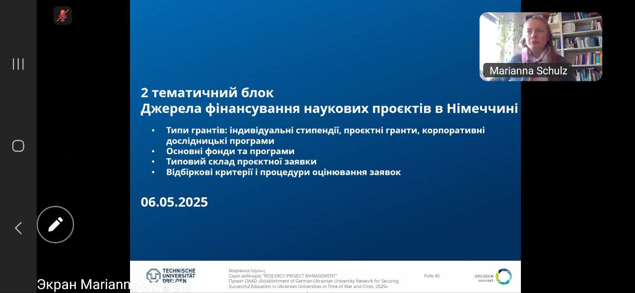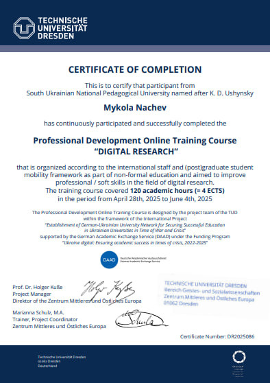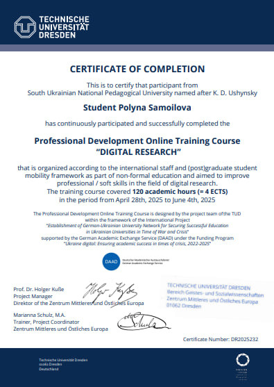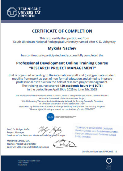 Здобувачі освіти ОПП «Менеджмент соціокультурної діяльності» Катерина Ковра, Вікторія Фіник, Полина Самойлова та ОНП «Філософія» Сергій Карастан та Микола Начев, а також науково-педагогічні працівники кафедри успішно завершили міжнародну мобільність в Технічному університеті Дрездена за програмами «Digital Research: Основи наукової діяльності» та «Research Project Management», мета яких – розвиток компетенцій у сфері організації та проведення наукових досліджень та реалізаціє проєктів студентами і молодими науковцями. Програма реалізується за підтримки Німецької служби академічних обмінів (DAAD) в рамках міжнародного проєкту «Establishment of German-Ukrainian University Network for Securing Successful Education in Ukrainian Universities in Time of War and Crisis» програми фінансування «Ukraine digital: Ensuring academic success in times of crisis, 2025». Дякуємо спікерці вебінарів Маріанні Шульц за високий професіоналізм, позитивну атмосферу та міжкультурну комунікацію! Участь наших здобувачів у міжнародних ініціативах не лише розширює їхній професійний горизонт, а й підтверджує, що наші освітні програми кафедри готують фахівців нового покоління – мобільних, етичних, креативних і здатних діяти в умовах глобальної нестабільності. З нетерпінням чекаємо нових зустрічей.