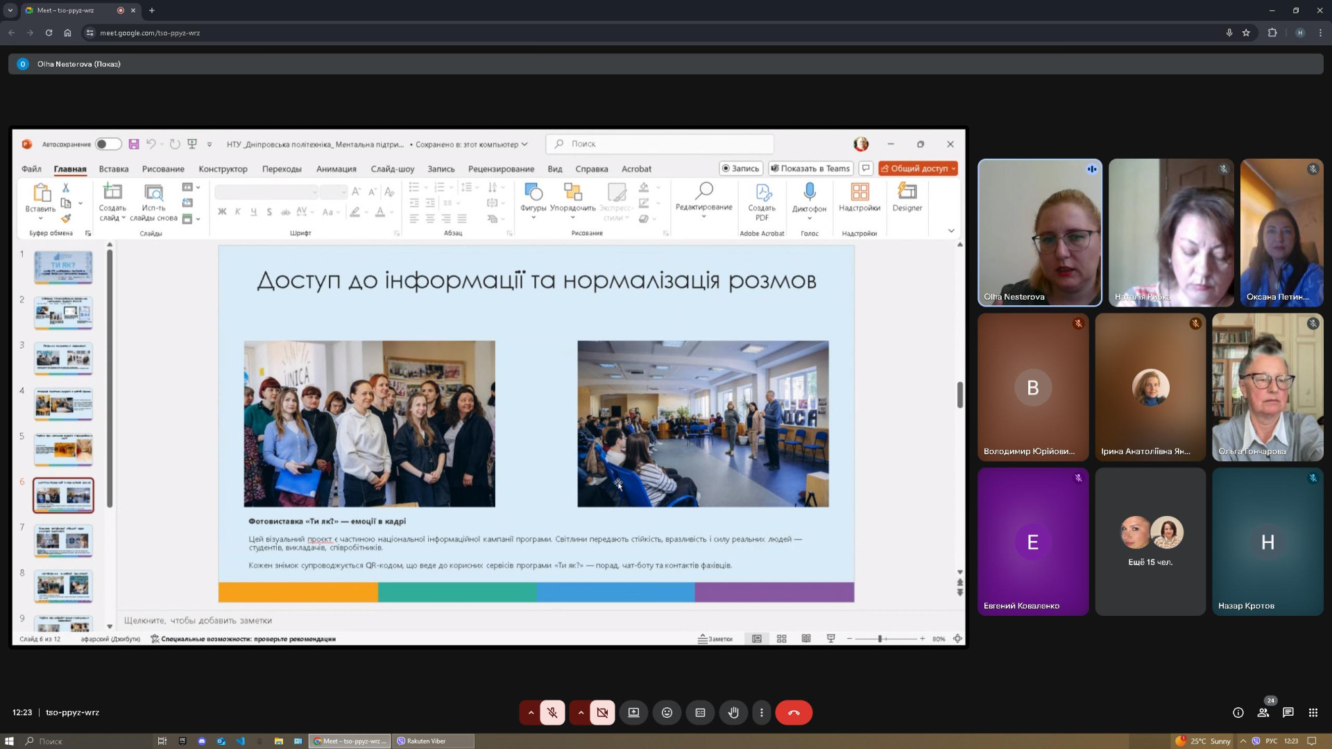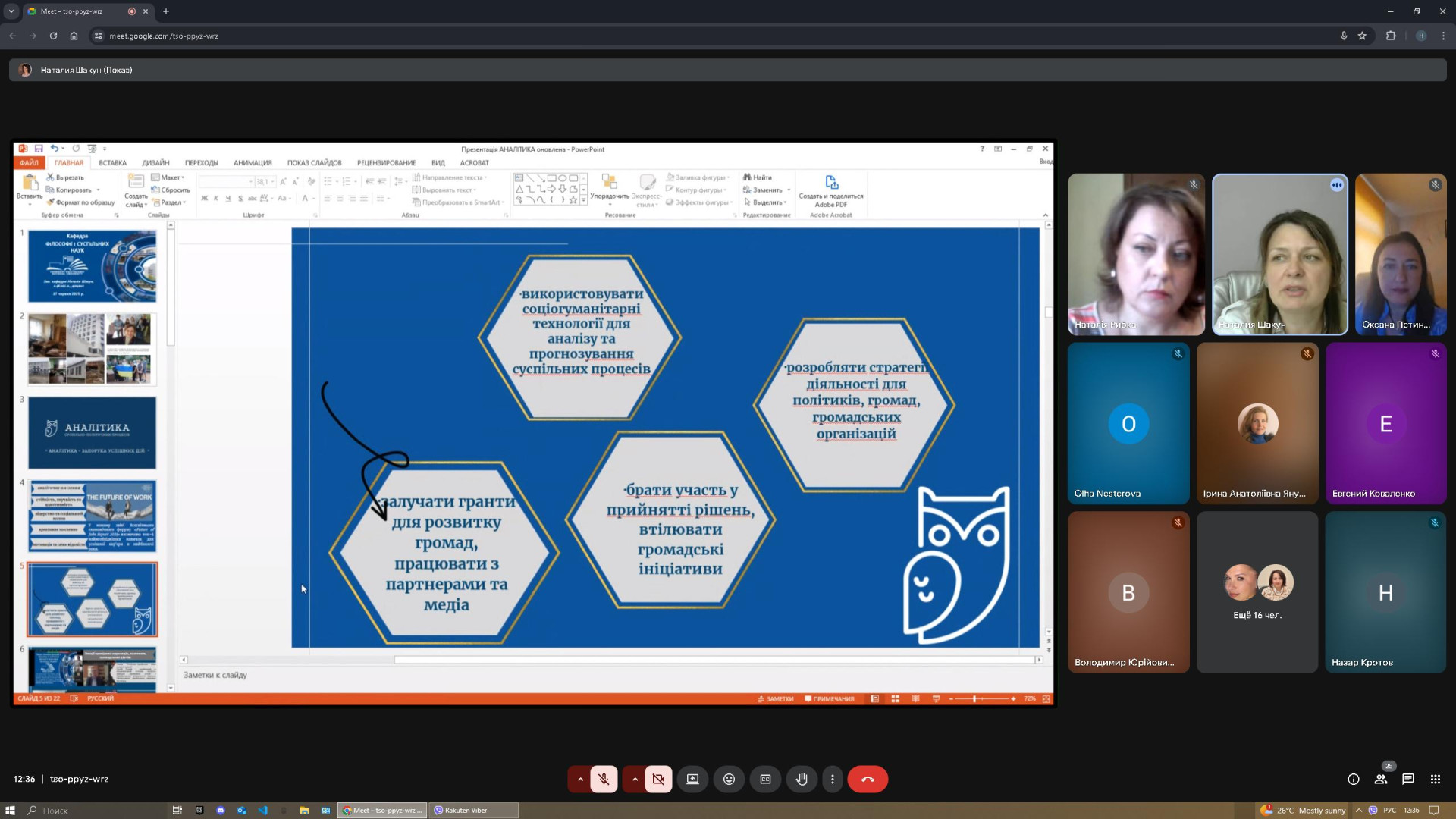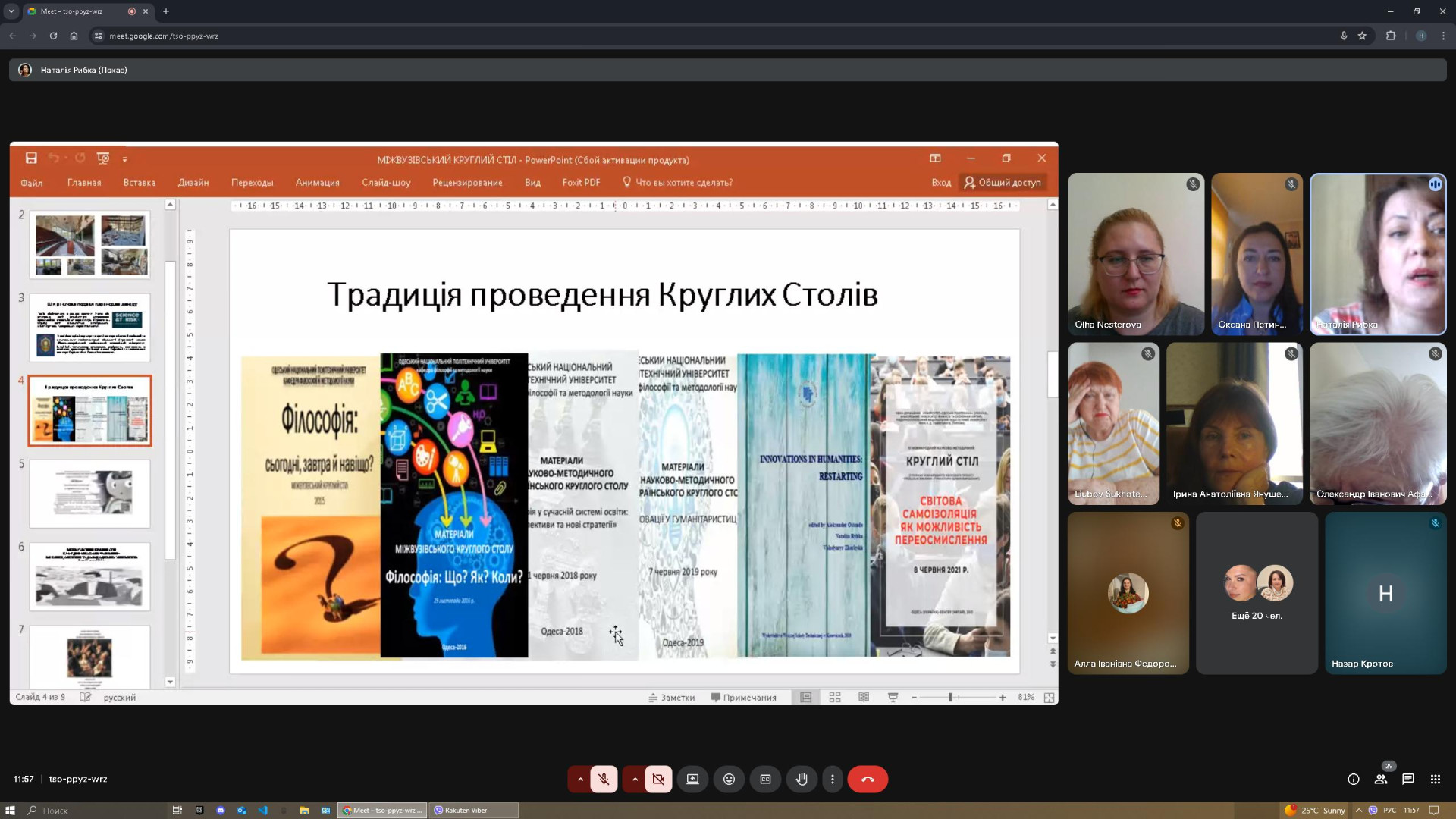 27 червня 2025 року відбувся міжвузівський круглий стіл, який об'єднав філософські спільноти кількох провідних університетів України. Захід став потужною платформою для міжінституційного діалогу, обміну досвідом і спільного осмислення ролі філософії в умовах війни та трансформаційного періоду в історії нашої країни. Щиро вдячні міжнародному проєкту «SCIENCE AT RISK», заснованому Академічною мережею Східної Європи, за допомогу в організації цієї події. Допомога, спрямована на підтримку українських науковців, які постраждали внаслідок війни, є значним внеском у збереження інтелектуального потенціалу та розвитку академічної культури України. Співорганізатори заходу – наша кафедра та кафедра філософії, історії та політології Одеської політехніки. Модератори – доц. Наталія Рибка (Одеська політехніка) та проф. Оксана Петінова (Університет Ушинського). Захід включав дві змістовні панелі: Панель 1. «Філософія в контексті освіти, пам’яті та викликів сучасності» – обговорено ключові напрями філософської думки у складних історичних обставинах. У центрі уваги – нові орієнтири вищої освіти, історична пам’ять як чинник культурного спротиву, етична рефлексія у кризові часи та потенціал філософії як інструменту психологічного впливу в аудиторії. Спікери – проф. Володимир Жарких, доц. Алла Федорова, проф. Олександр Афанасьєв, доц. Ірина Янушевич, доц. Наталя Рибка. Панель 2. «Педагогічні технології та психологічні інновації» – учасники ділилися досвідом викладання філософії в умовах війни, трансформаціями навчального процесу та інноваційними підходами до формування критичного мислення. Фокус було зосереджено на адаптації філософської освіти до нових викликів, а також на впровадженні інноваційних підходів в умовах невизначеності. Особлива подяка учасникам ЗВО-партнерів: доц. Ользі Нестеровій (НТУ «Дніпровська політехніка»), доц. Наталії Шакун (НУ «Чернігівська політехніка»), студентам Нікіті Стрєлку та Світлані Буглак (ОП «Аналітика суспільно-політичних процесів»), які презентували потужне бачення філософії як середовища критичного мислення для молоді.