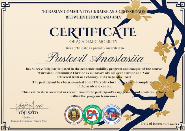 Протягом весняного семестру магістранти програми «Політологія. Українські та європейські політичні студії» (Афанасьєва А., Пустовіт А., Таргоніна М., Левенець М., Буковський С., Коваль О.) разом із гарантом освітньої програми доцентом Інною Пронозою пройшли навчання в межах міжнародного академічного проєкту «Євразійська спільнота: Україна як перехрестя між Європою та Азією», який реалізовано за підтримки Євразійського фонду (Токіо, Японія). Навчання відбувалося на базі Університету Ушинського онлайн у період з лютого по травень 2025 року.