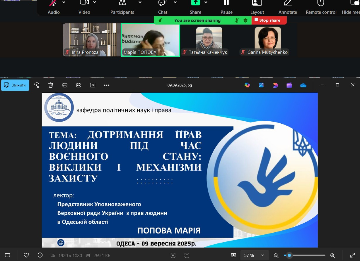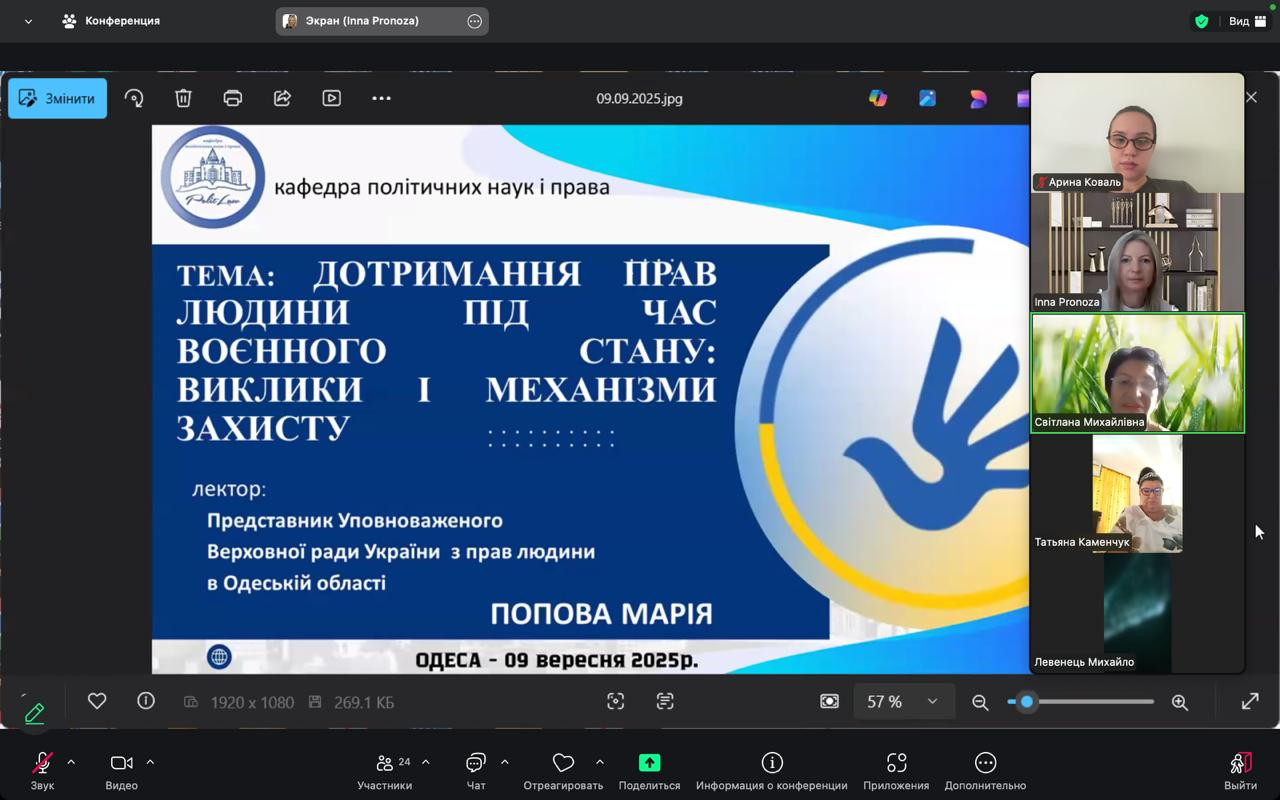 9 вересня 2025 року на кафедрі політичних наук і права Університету Ушинського відбулася гостьова лекція професіонала-практика на тему «Дотримання прав людини під час воєнного стану: виклики і механізми захисту». Лектором виступила Марія Попова, кандидат політичних наук, територіальний Представник Уповноваженого Верховної Ради України з прав людини в Одеській області.