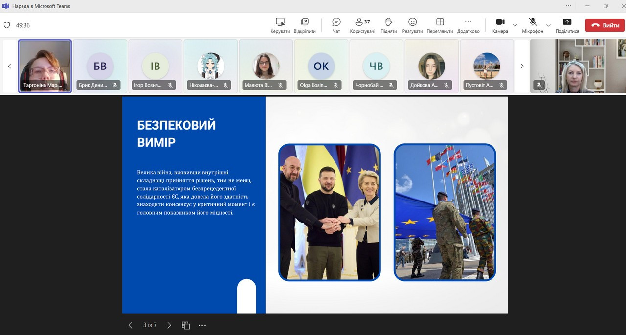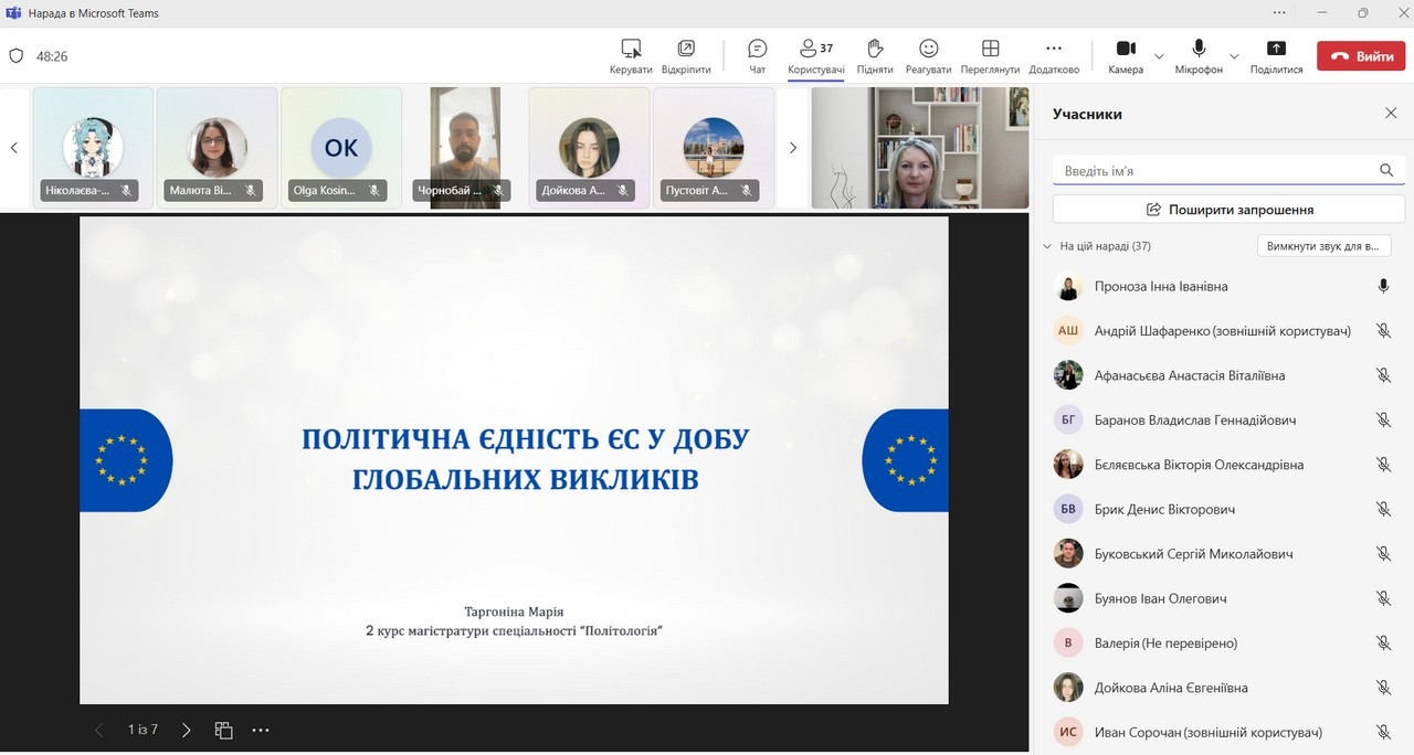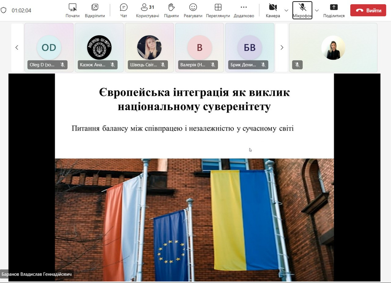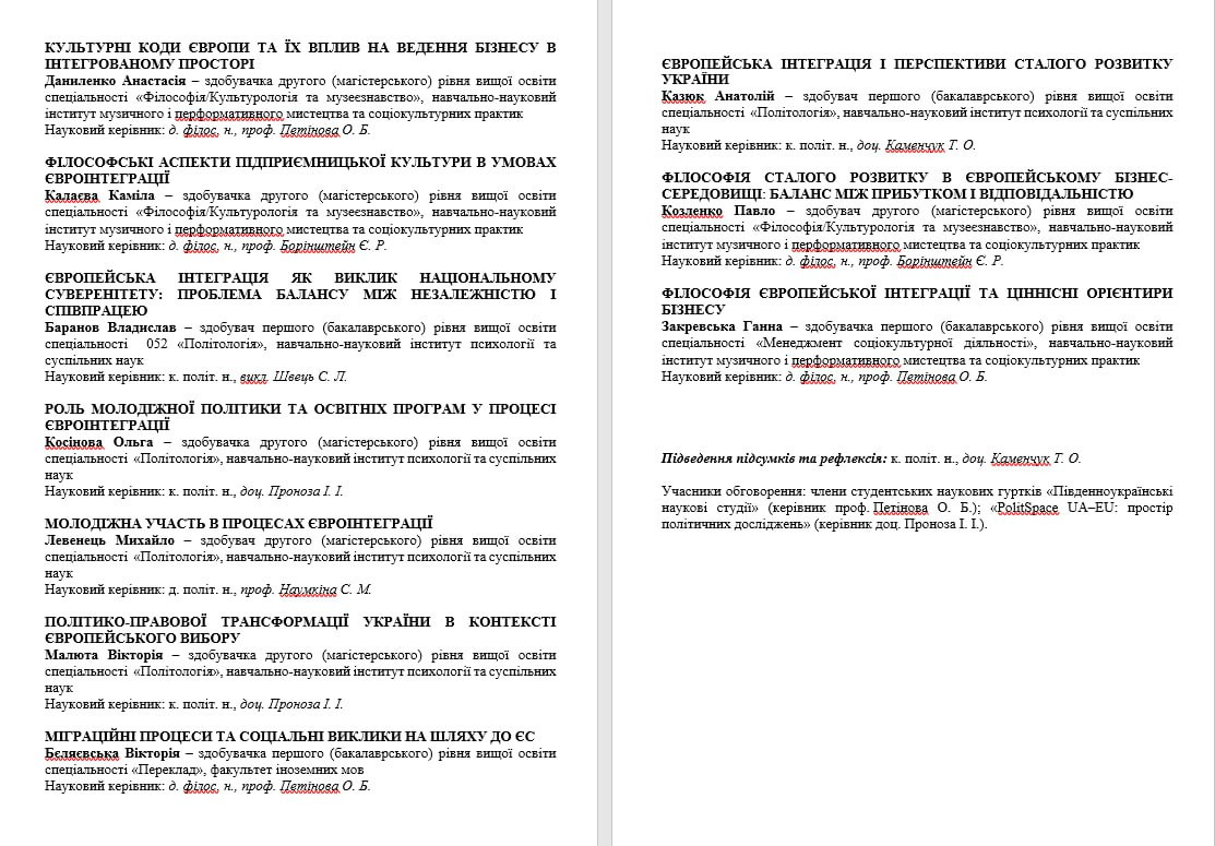 Ініціаторами заходу виступили представники кафедри політичних наук і права доц. Інна Проноза та кафедри філософських і соціологічних студій та соціокультурних практик – проф. Оксана Петінова. Зобувачі-політологи відкрили дискусійний майданчик, запропонувавши бачення європейської інтеграції як багатовимірного процесу, що визначає майбутнє України та трансформує політичні інститути, соціальні практики й ідентичності.