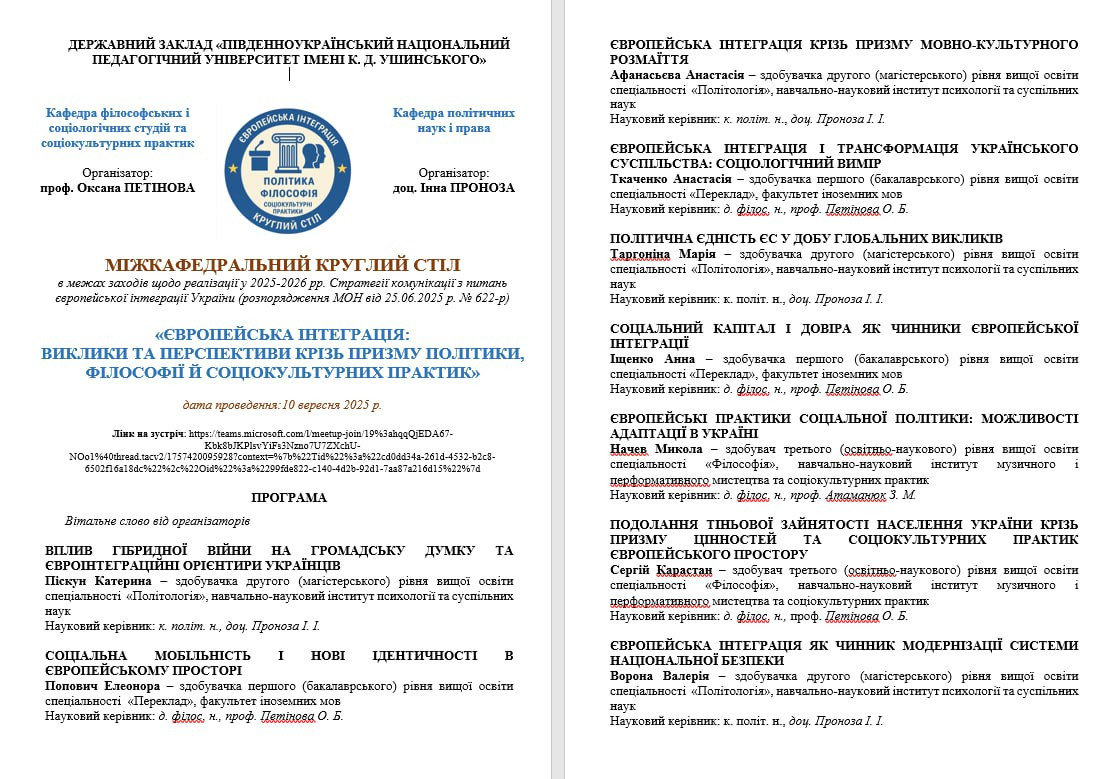 10 вересня 2025 року в межах реалізації Стратегії комунікації з питань європейської інтеграції України на 2025–2026 рр. (розпорядження МОН від 25.06.2025 р. № 622-р) відбувся Міжкафедральний круглий стіл «Європейська інтеграція: виклики та перспективи крізь призму політики, філософії й соціокультурних практик».