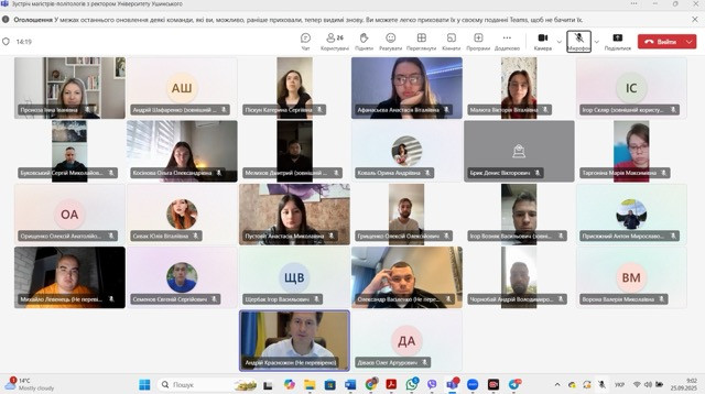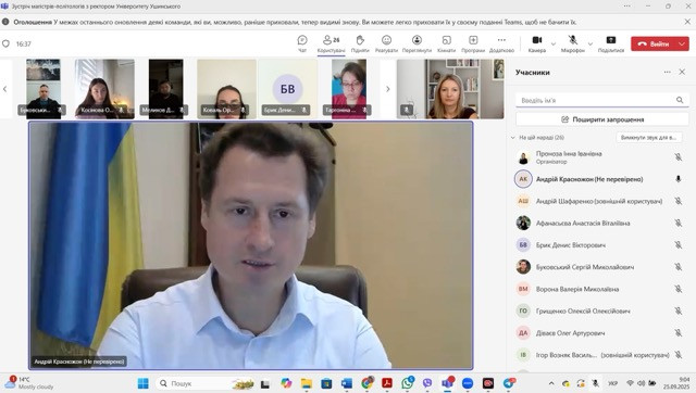 25 вересня 2025 року відбулася традиційна зустріч ректора університету Андрія КРАСНОЖОНА зі здобувачами першого року навчання за другим (магістерським) рівнем вищої освіти освітньої програми «Політологія. Українські та європейські політичні студії». Захід було організовано гарантом освітньої програми, доцентом кафедри політичних наук і права Інною ПРОНОЗОЮ.