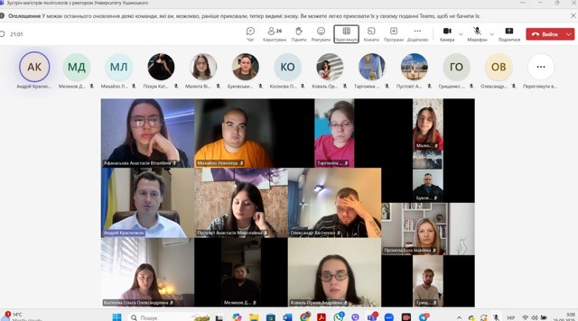 До зустрічі долучилися й здобувачі другого року навчання магістерської програми. Вони не лише підтримали атмосферу діалогу, а й поділилися своїм баченням подальшого розвитку студентського середовища. Зокрема, обговорювали перспективи участі молоді університету в громадських та волонтерських проєктах, а також можливості подальшої співпраці між студентськими ініціативами та адміністрацією університету. Такі пропозиції отримали схвальну підтримку ректора, який наголосив на важливості активної позиції студентів у розбудові сучасного університетського простору.