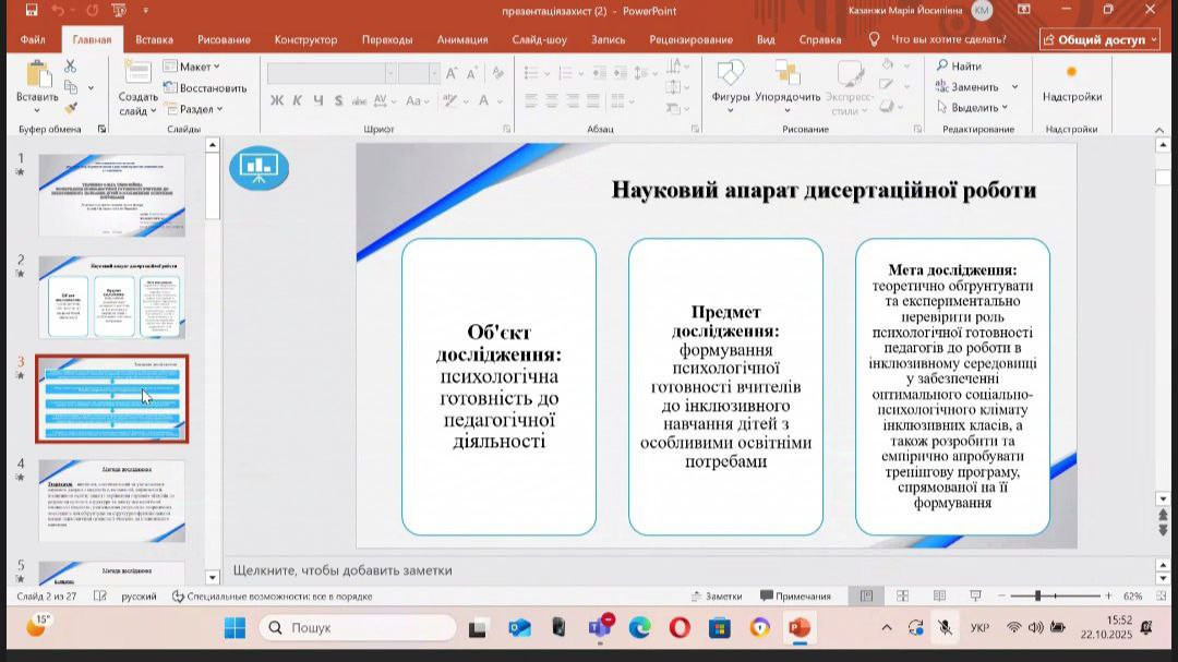 22 жовтня 2025 року відбулося розширене засідання кафедри загальної та диференціальної психології Університету Ушинського в онлайн форматі на платформі Microsoft Teams. Під час засідання були представлені та обговорені дисертаційні дослідження здобувачок 4 курсу третього (освітньо-наукового) рівня вищої освіти за спеціальністю 053 Психологія.