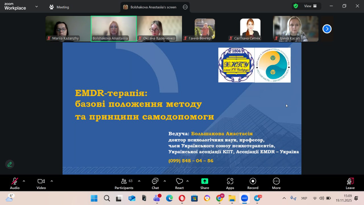19 листопада 2025 року відбулася гостьова лекція на тему «EMDR-терапія: базові положення методу та принципи самодопомоги», яку провела Анастасія Большакова – доктор психологічних наук, професор кафедри психології ХНПУ імені Г. С. Сковороди, член УАКПТ та EMDR-Україна.