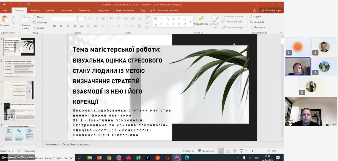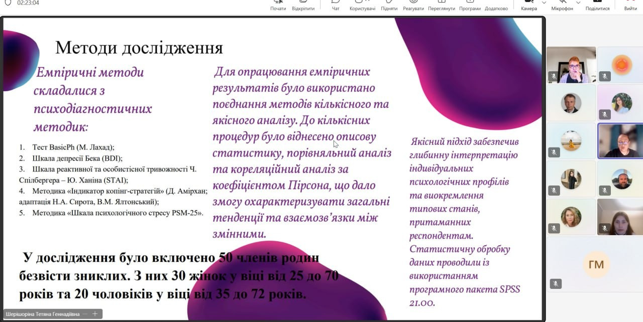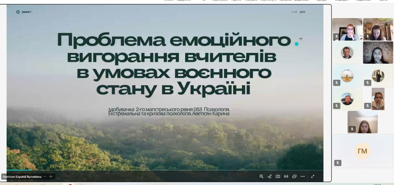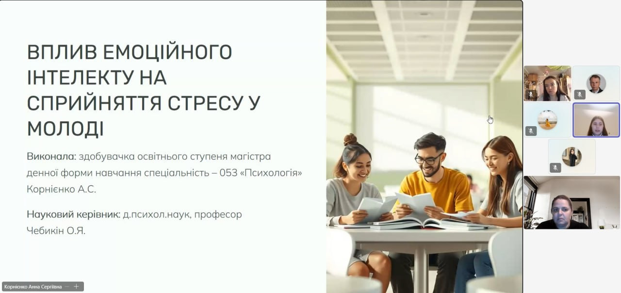 2 грудня 2025 року під час передзахисту кваліфікаційних магістерських робіт здобувачів другого магістерського рівня денної форми навчання за спеціальністю 053 «Психологія» була представлена тематика, що відображає актуальні напрями екстремальної, кризової та прикладної психології в умовах воєнного стану. Магістерські дослідження були присвячені особливостям психологічного стану родин безвісти зниклих та формам їх психологічної підтримки, проблемі емоційного вигорання вчителів в умовах воєнного стану в Україні, впливу емоційного інтелекту на сприйняття стресу у молоді, візуальній оцінці стресового стану людини з метою визначення стратегій взаємодії та корекції, а також особливостям стресових переживань осіб у період воєнного стану, а також інших актуальних проблем сучасної психологічної науки і практики.