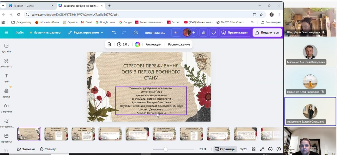 Представлені теми засвідчили спрямованість магістерських робіт на аналіз психологічних наслідків війни, дослідження ресурсів особистості, механізмів подолання стресу та розробку практично орієнтованих підходів до психологічної допомоги різним категоріям населення, що відповідає сучасним викликам професійної діяльності психолога. Усі представлені роботи відповідали належному науково методичному рівню та були допущені до подальшого захисту.