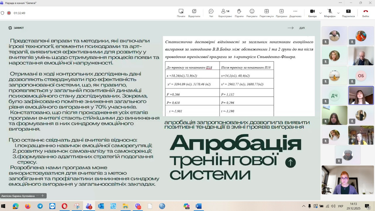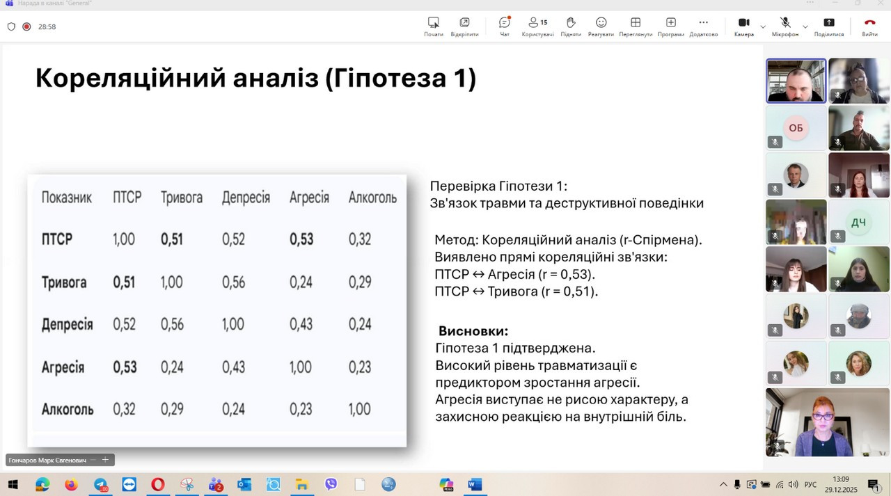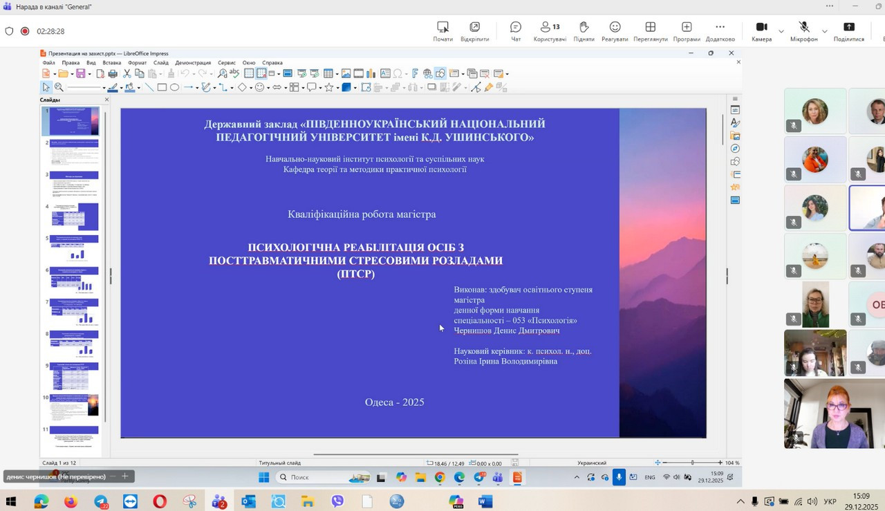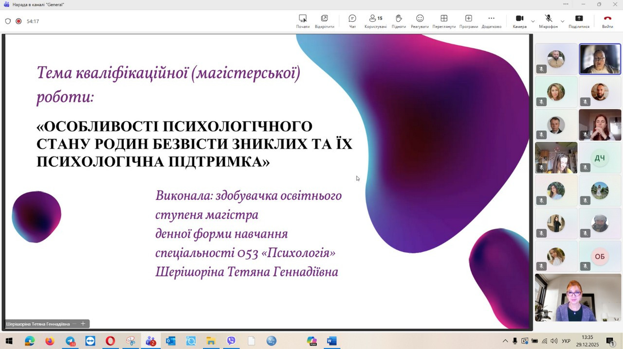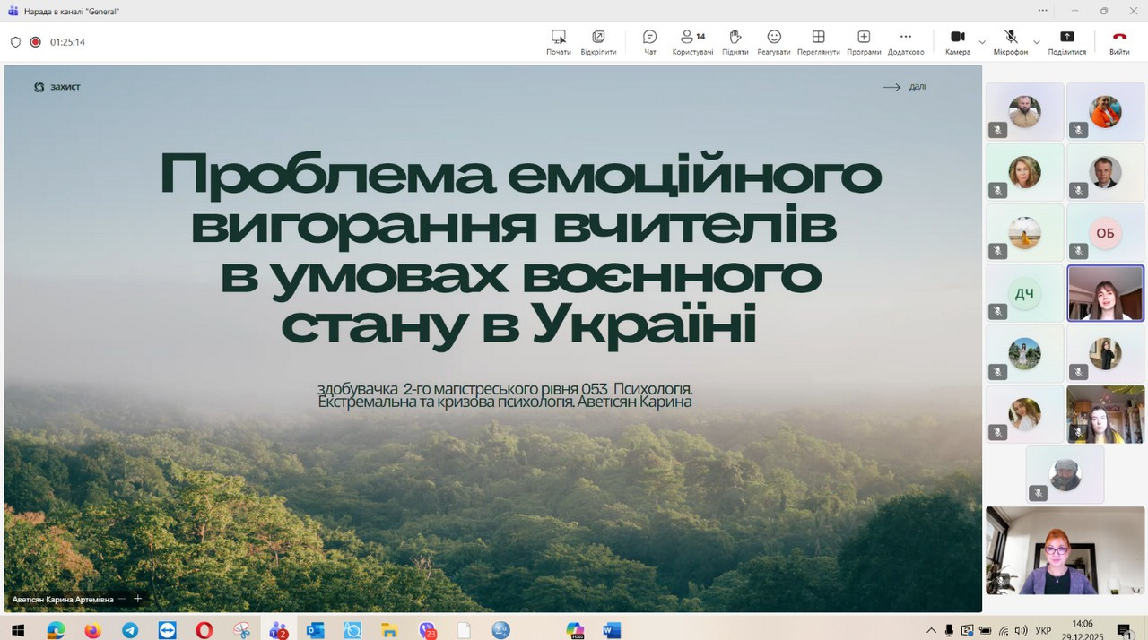 29 грудня 2025 року відбувся захист кваліфікаційних (магістерських) робіт здобувачів денної форми навчання за зазначеною освітньо-професійною програмою. Представлені магістерські дослідження продемонстрували високий рівень інтеграції теоретичних положень сучасної психологічної науки з практичними завданнями професійної діяльності психолога в умовах підвищеного стресу, невизначеності та соціальних трансформацій, зумовлених воєнним станом. Зміст робіт охоплював широкий спектр проблем, пов’язаних із психологічним супроводом особистості в кризових та екстремальних умовах, дослідженням адаптаційних можливостей, стресостійкості та ресурсного потенціалу людини, а також розробкою й апробацією практичних моделей психологічної допомоги різним категоріям населення. Особливий акцент було зроблено на аналітичному осмисленні складних психологічних феноменів, умінні обґрунтовувати вибір методів психодіагностики та психокорекції, а також на професійній рефлексії результатів власного дослідження. За результатами захисту підтверджено, що випускники денної форми навчання за освітньо-професійною програмою «Практична психологія. Екстремальна та кризова психологія» досягли програмних результатів навчання, які передбачають здатність аналізувати та інтерпретувати поведінку людини в екстремальних ситуаціях, прогнозувати психологічні наслідки дії кризових чинників, ефективно організовувати професійну взаємодію та приймати відповідальні рішення в умовах підвищеної напруги. Магістранти продемонстрували готовність до надання кваліфікованої психологічної допомоги особистості у кризовому стані, спрямованої на мобілізацію її внутрішніх ресурсів, підтримку життєстійкості та психологічного відновлення, зокрема в умовах війни.