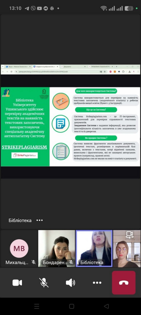 Зустріч було присвячено особливостям академічної доброчесності та використанню штучного інтелекту; узагальненим нормативним документам, які представлені у базі даних Університету Ушинського.
