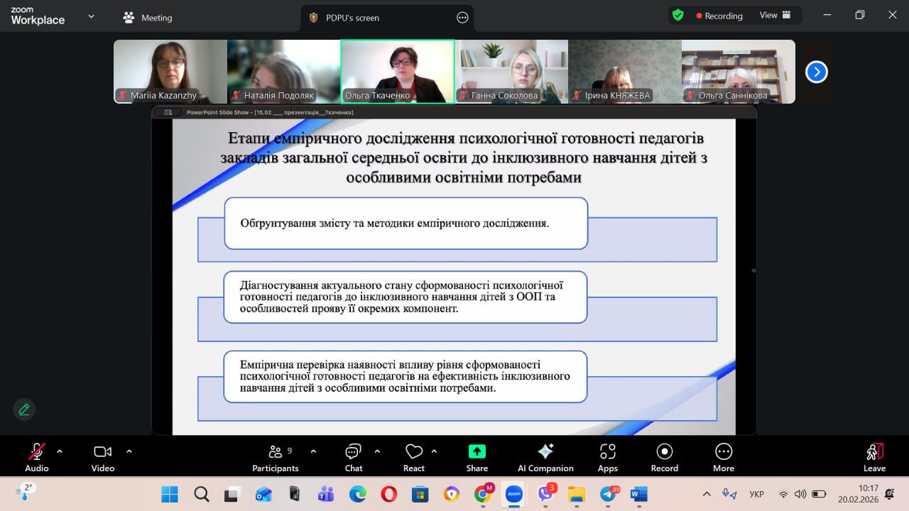В Університеті Ушинського 20 лютого 2026 року на платформі Zoom відбулося засідання разової спеціалізованої вченої ради з захисту дисертації аспірантки Університету Ушинського Ольги ТКАЧЕНКО з теми «Формування психологічної готовності вчителів до інклюзивного навчання дітей з особливими освітніми потребами» на здобуття наукового ступеня доктора філософії зі спеціальності 053 Психологія.