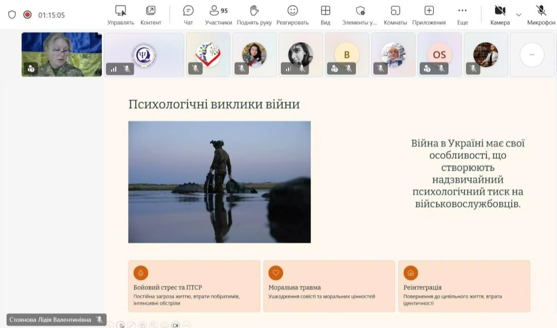 8 березня 2026 року відбулася зустріч на тему: «Військовий психолог у ЗСУ: задачі, функції та роль». Спікеркою заходу стала Оксана ЗЕЛЕНЕНЬКА — лейтенант, старший офіцер групи контролю бойового стресу 39 бригади морської піхоти, яка є випускниця освітньо-професійної програми другого (магістерського) рівня вищої освіти кафедри загальної та диференціальної психології.