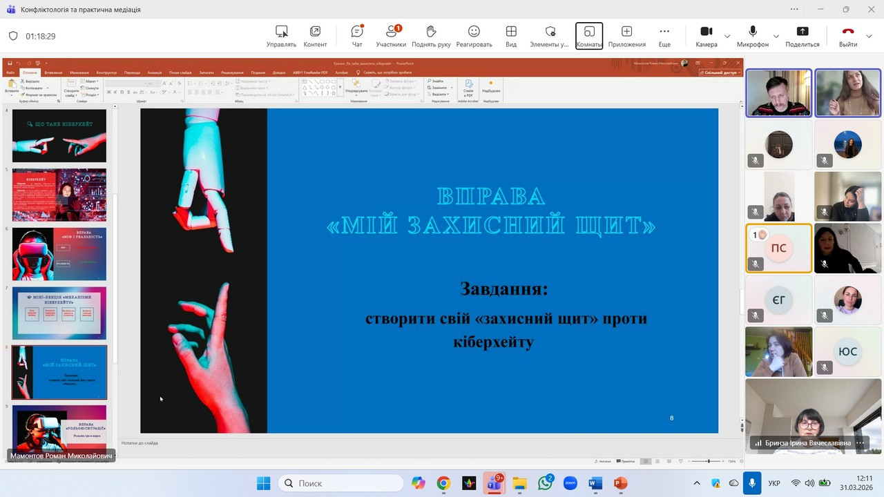 31 березня в онлайн форматі відбувся тренінг «Як себе захистити від кіберхейту» у рамках Міжнародного проєкту DAAD-57834338 «Транснаціональні освітні та дослідницькі стратегії проти цифрової ненависті – 2026» (Німеччина, Україна, Молдова, Киргизстан). Тренінг провів магістрант 1 курсу спеціальності Прикладна та практична психологія Інституту психології та суспільних наук Університету Ушинського Роман Мамонтов за підтримки медіатора Ірини Бринзи. Метою тренінгу стало розвінчання поширених міфів про кіберхейт, навчання учасників критичному мисленню та вмінню розпізнавати небезпечні установки У програмі також було застосовано міні-лекцію «Механізми кіберхейту» та інтерактивні вправи, спрямовані на формування розуміння явища цифрової ненависті та практичні навички протидії йому.