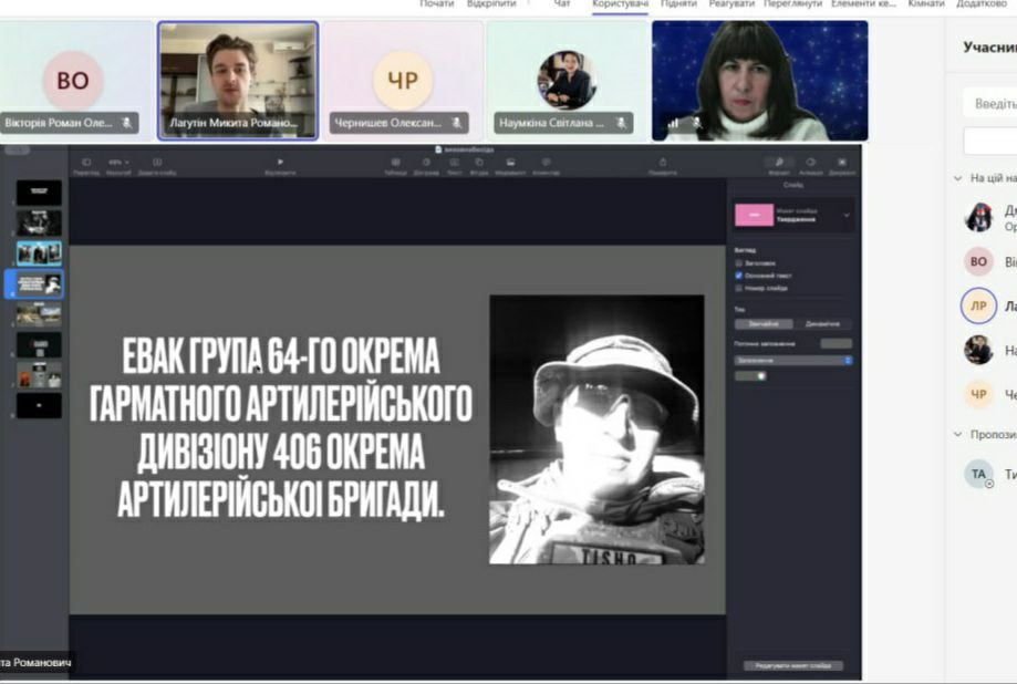Спільний виховний захід «Обличчя захисту України: історії, що надихають» провели студенти 1 курсу Олександр ЧЕРНИШОВ, Вікторія РОМАН і аспірант 2 курсу спеціальності «Політологія» Микита ЛАГУТІН разом із доцентом Світланою ДМИТРАШКО. З підтримуючим словом до молоді звернулася завідувач кафедри, професор Світлана НАУМКІНА.