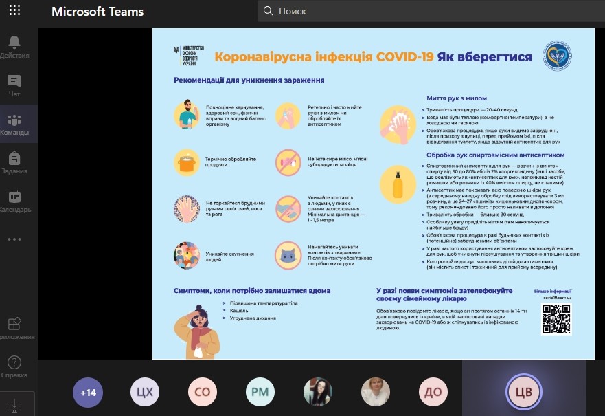 В порядку денному розглянули питання щодо організації освітнього процесу в умовах карантину (завідувач кафедри Долженков О.О.); профілактики інфікування і поширення коронавірусу (здобувачка 2 курсу магістратури Царичанська Катерина).