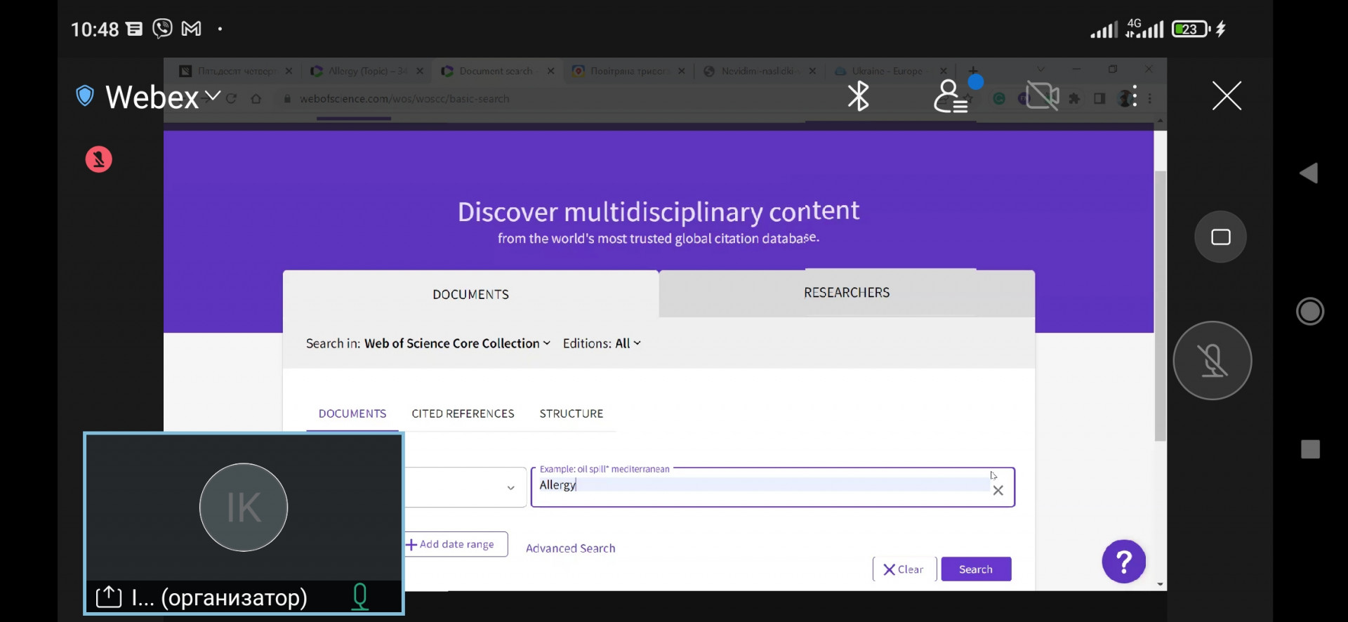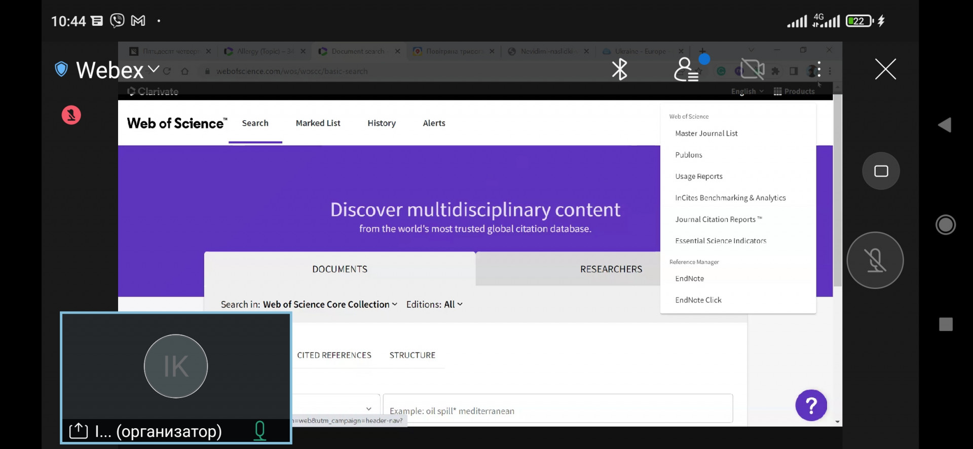 Основні проблеми, як розглядалися: Де знайти ключову літературу за своєю темою? Де знайти партнера або рецензента? Які установи та науковці є лідерами за даним напрямом? Як з ними зв’язатися? Які видання спеціалізуються на даній темі? Які установи фінансували такі дослідження? Як знайти відповіді на ці питання за допомогою базового пошуку з використанням операторів пошуку та символів скорочення. Як виділити найцитованіші роботи останніх років? Як зберегти та поділитися з колегами найцікавішими даними? Як проаналізувати вибірку документів? Вебінар був змістовним та актуальним.