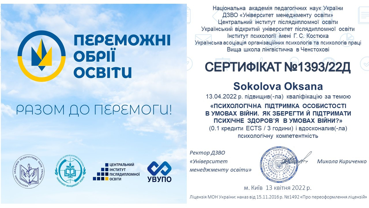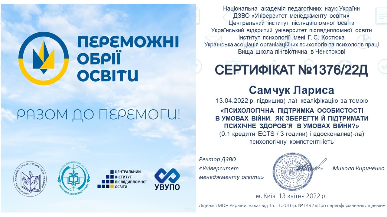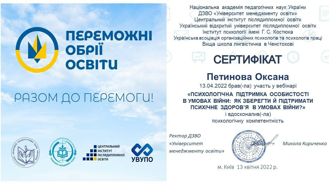13 квітня 2022 року науково-педагогічні працівники кафедри філософії, соціології та менеджменту соціокультурної діяльності (проф. Петінова Оксана, викл. Самчук Лариса) та аспіранти спеціальності 033 Філософія (Ніколаєва Іванна, Соколова Оксана) брали участь у міжнародному вебінарі «Психологічна підтримка особистості в умовах війни: як зберегти й підтримати психічне здоров’я в умовах війни» (Україна – Польща). Вітаємо їх з отриманням сертифікатів!