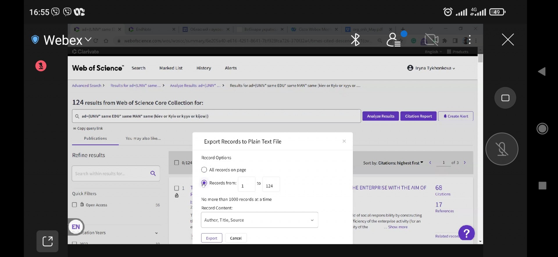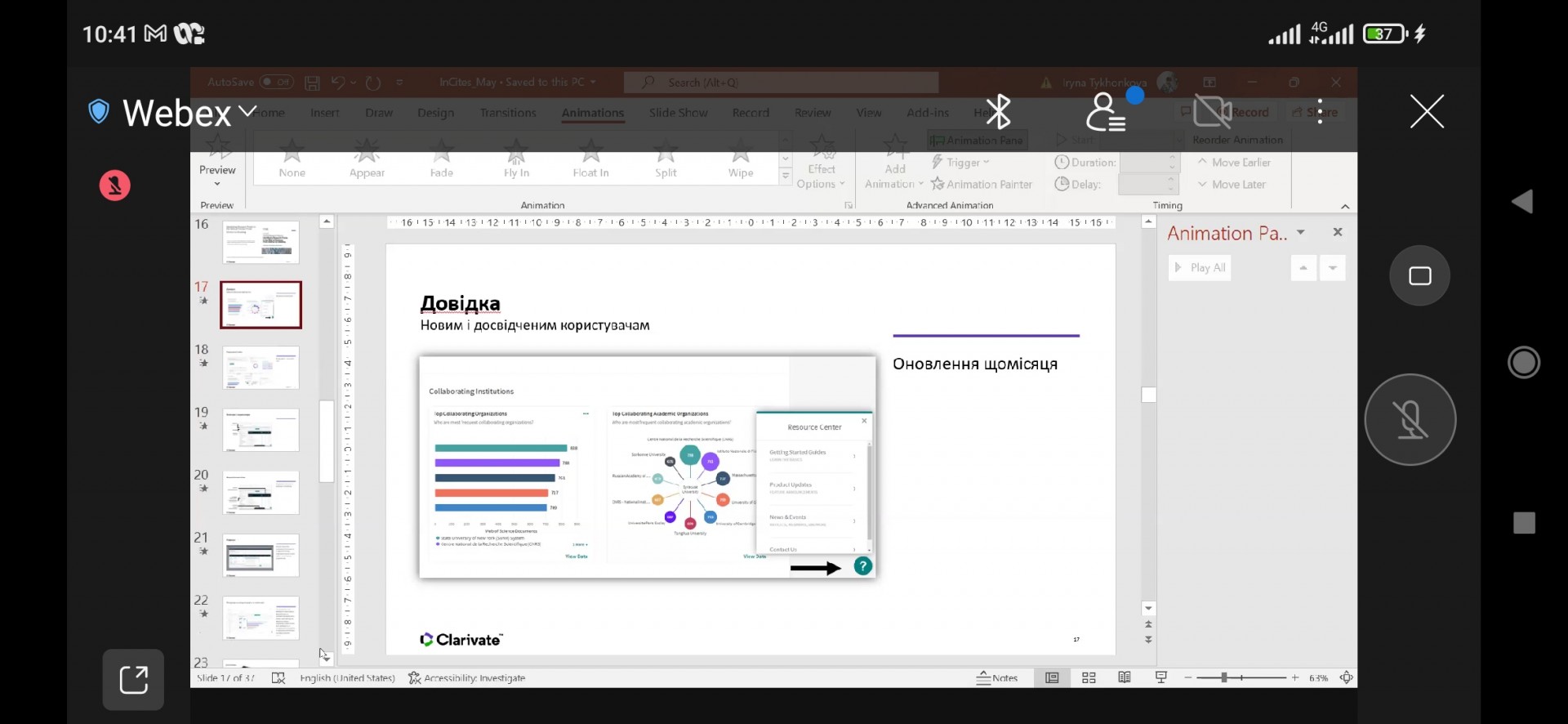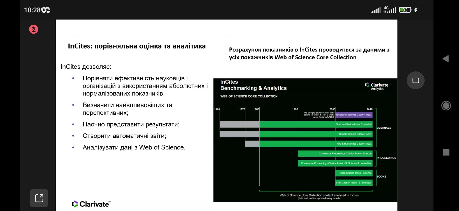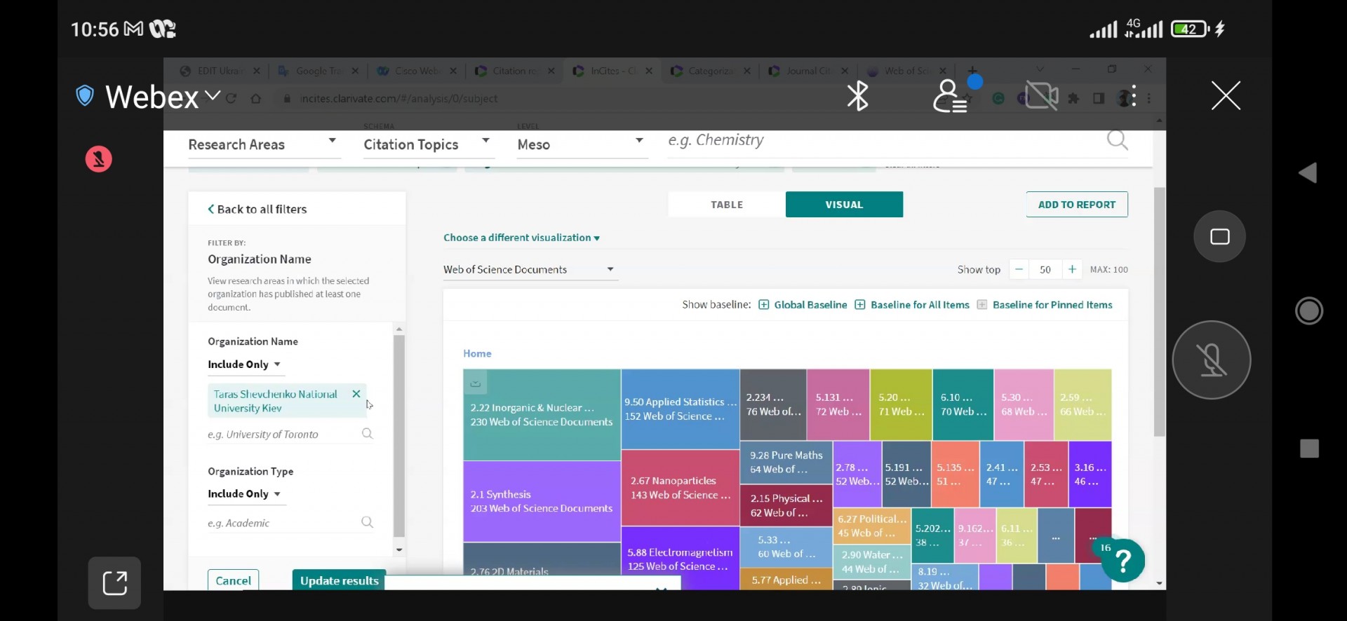 10 та 12 травня 2022 науково-педагогічні працівники та аспіранти спеціальності 033 Філософія кафедри філософії, соціології та менеджменту соціокультурної діяльності взяли участь у вебінарах на тему «Профіль установи: створення, корегування, використання» та «Можливості аналітичного інструменту InCites для науковця та адміністратора». Основні питання, які розглядалися: Коли, навіщо і кому необхідно оцінювати публікаційну діяльність організації? Які показники можна та варто дивитися? Складнощі та шляхи подолання при пошуку і аналізу публікацій установи. Створення та підтримання в актуальному стані профілю установи у Web of Science Core Collection. Як створити і експортувати в певному форматі список публікацій організації на певні роки? Яка установа більш ефективна в певній галузі, чому? Готові автоматичні звіти і результати з урахуванням запитів користувача, та інші.