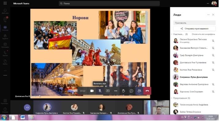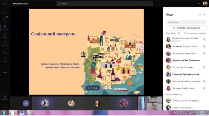 11 травня 2022 року зі студентами 4 курсу спеціальності 014 «Середня освіта (Мова і література (англійська))» (викладач – проф. Петінова О. Б.)було проведене відкрите інтегроване заняття з соціології, приурочене до Дня Європи. Обговорені питання права і гідності людини в Європі, європейська демократія та свобода; шлях інтеграції людини до Європейського Союзу. Студенти Дзиговська Яна та Смірнова Луїза підготували та виступили з презентацією «Особливості соціальної організації та соціального контролю Іспанії».
