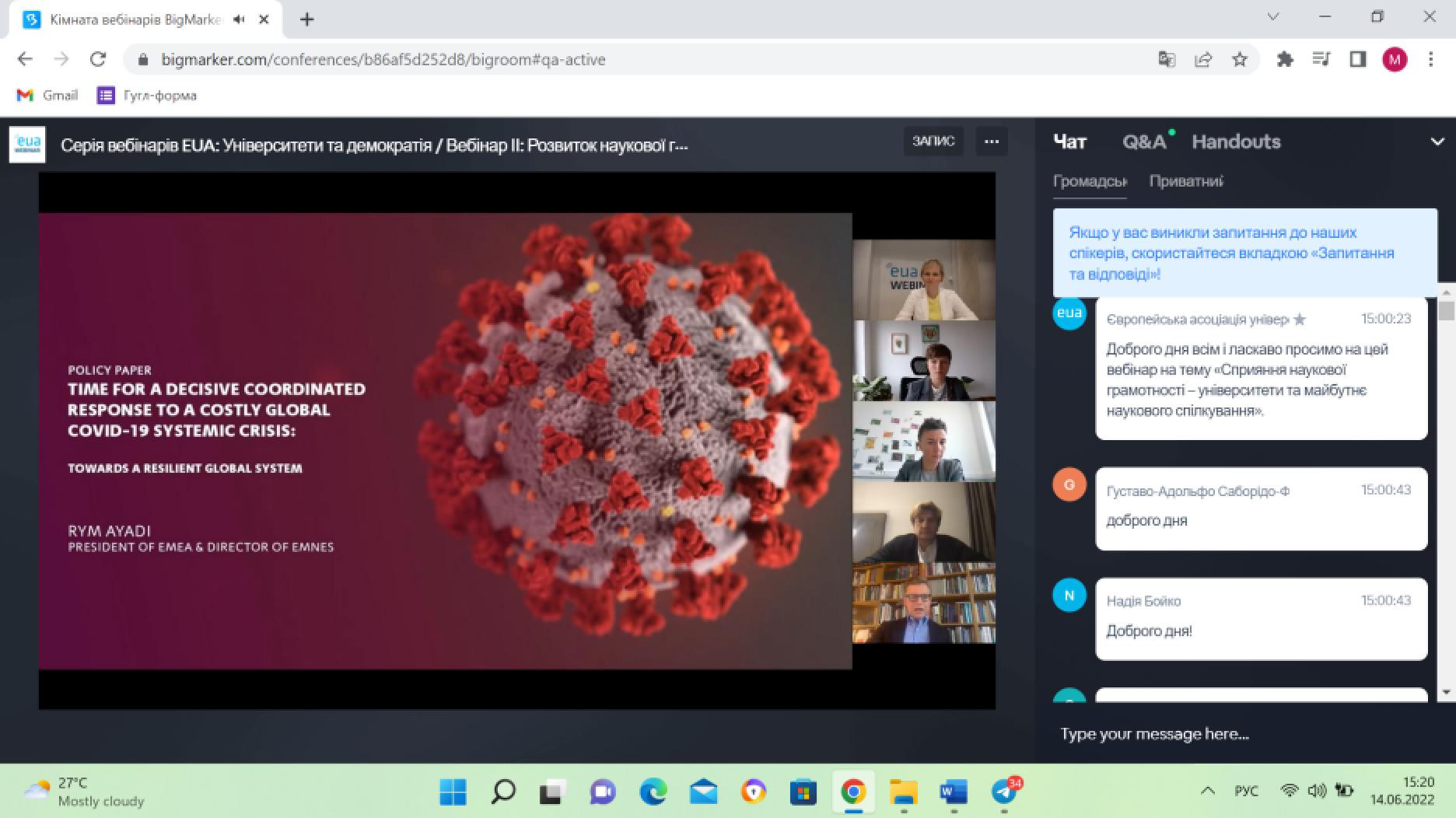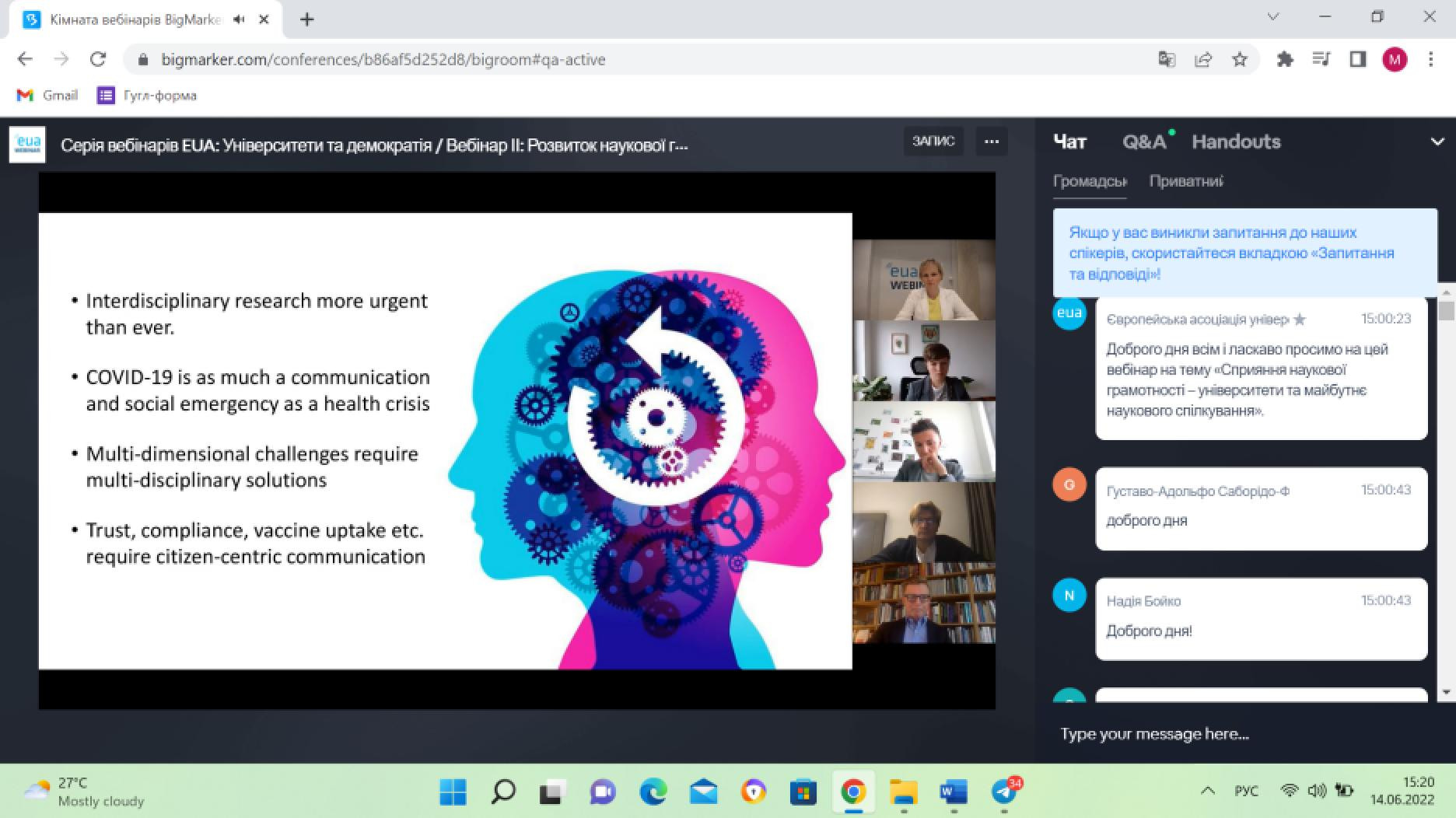 14 червня 2022 р. викладачі та здобувачі ОНП Психологія відвідали вебінар, організований Європейською асоціацією університетів «Підвищення наукової грамотності – майбутнє наукової комунікації».