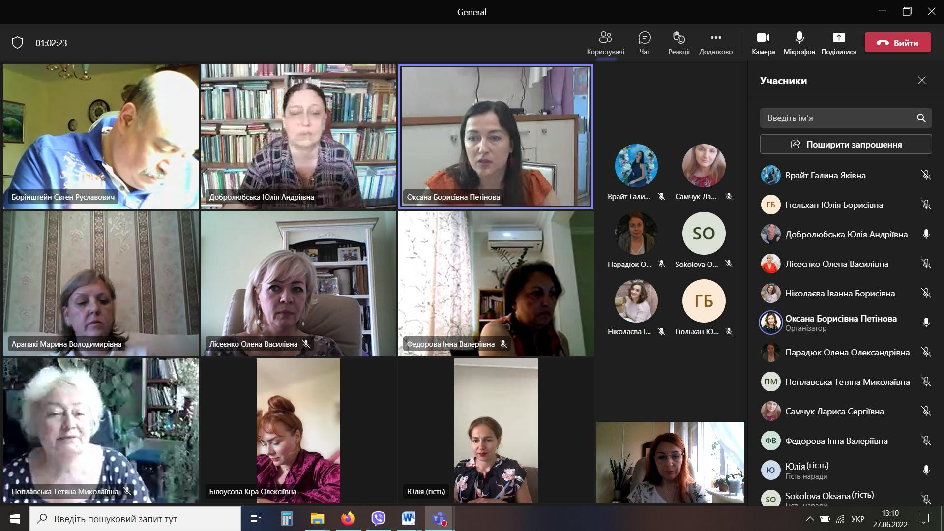27 червня 2022 року на засіданні кафедри філософії, соціології та менеджменту соціокультурної діяльності Університету Ушинського здобувачі третього (освітньо-наукового) рівня вищої освіти за спеціальністю 033 Філософія звітували за 2021-2022 навчальний рік. На засіданні кафедри були присутні члени кафедри, гарант освітньої програми ОНП 033 (д.філос.наук, проф. Петінова О. Б.), члени робочих груп ОНП, аспіранти всіх років навчання, наукові керівники. За результатами звітів здобувачів, відгуків наукових керівників було відзначено, що всі аспіранти успішно виконали індивідуальний навчальний та науковий плани роботи, продемонстрували науковий потенціал. Роботу всіх аспірантів рішенням кафедри було атестовано і переведено на наступний рік навчання. Завідувач кафедри проф. Борінштейн Є. Р. і гарант ОНП проф. Петінова О. Б. привітали всіх аспірантів із успішним завершенням 2021-2022 року і побажали їм продуктивної та творчої роботи у новому навчальному році. Здобувачі 1 року навчання (вступ: весна) захистили теми своїх наукових дисертаційних досліджень (Марина Арапакі, Інна Федорова, Кіра Білоусова).