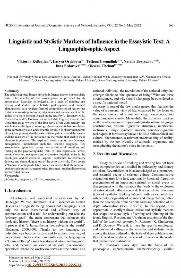 Здобувачка вищої освіти третього (освітньо-наукового) рівня 1-го року навчання (вступ: весна 2022) Інна Федорова успішно взяла участь в он-лайн семінарі «Цифрові інструменти google для вищої освіти» та отримала сертифікат. Також надруковано статтю (Web of Sienсe) «Мовно-стилістичні маркери впливу в есеїстичному тексті: Лінгвофілософський аспект» : Linguistic and Stylistic Markers of Influence in the Essayistic Text: A Linguophilosophic Aspect // IJCSNS International Journal of Computer Science and Network Security, VOL.22 No.5 З текстом можна ознайомитись за посиланням: