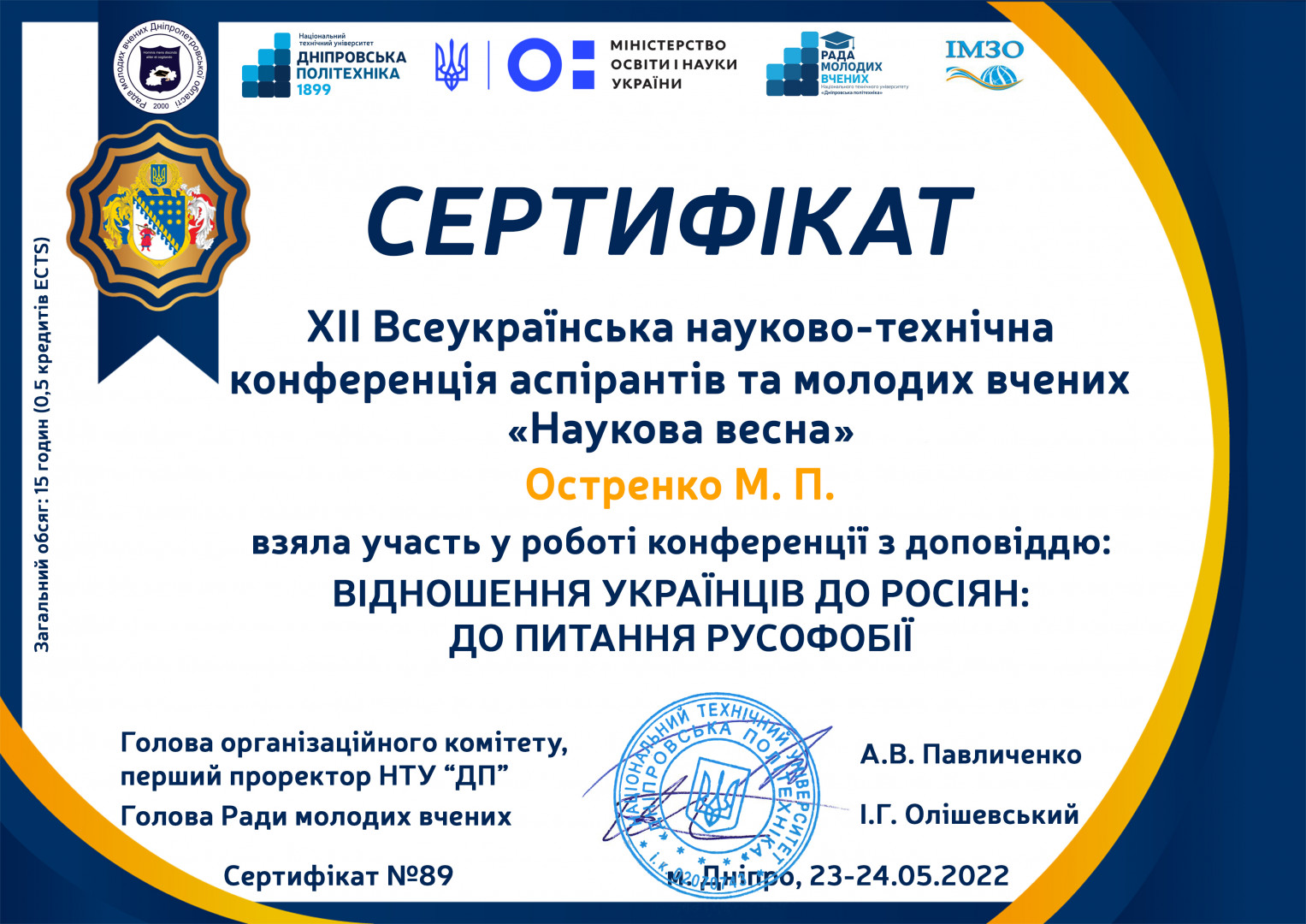 Після засідання привітали студентку 4-го курсу факультету іноземних мов спеціальності 014 Середня освіта (Мова і література (китайська)), Остренко Маріанну, з отриманням довгоочікуваного сертифікату про участь у ХІІ Всеукраїнській науково-технічній конференції аспірантів та молодих вчених «НАУКОВА ВЕСНА» 2022 р., що проходила на базі НТУ «Дніпровська політехніка». Тема доповіді – «Русофобія. Відношення українців до росіян (на прикладі соціологічного дослідження»), Маріанну визнано переможницею секції «Гуманітарні проблеми освіти».