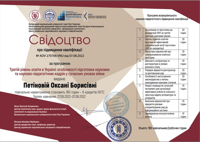 Гарант ОНП Філософія за спеціальністю 033 «Філософія» доктор філософських наук, професор кафедри філософії, соціології та менеджменту соціокультурної діяльності Петінова О. Б. успішно завершила Всеукраїнське науково-педагогічне підвищення кваліфікації за програмою «Третій рівень освіти в Україні: особливості підготовки наукових та науково-педагогічних кадрів у сучасних умовах війни», що тривало з 27.06.2022 р. по 07.08.2022 р. Організатори: Волинський національний університет імені Лесі Українки, Мелітопольський державний педагогічний університет імені Богдана Хмельницького, Національний технічний університет «Дніпровська політехніка», Центр українсько-європейського наукового співробітництва. Вітаємо з отриманням сертифікату.