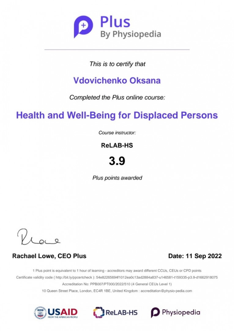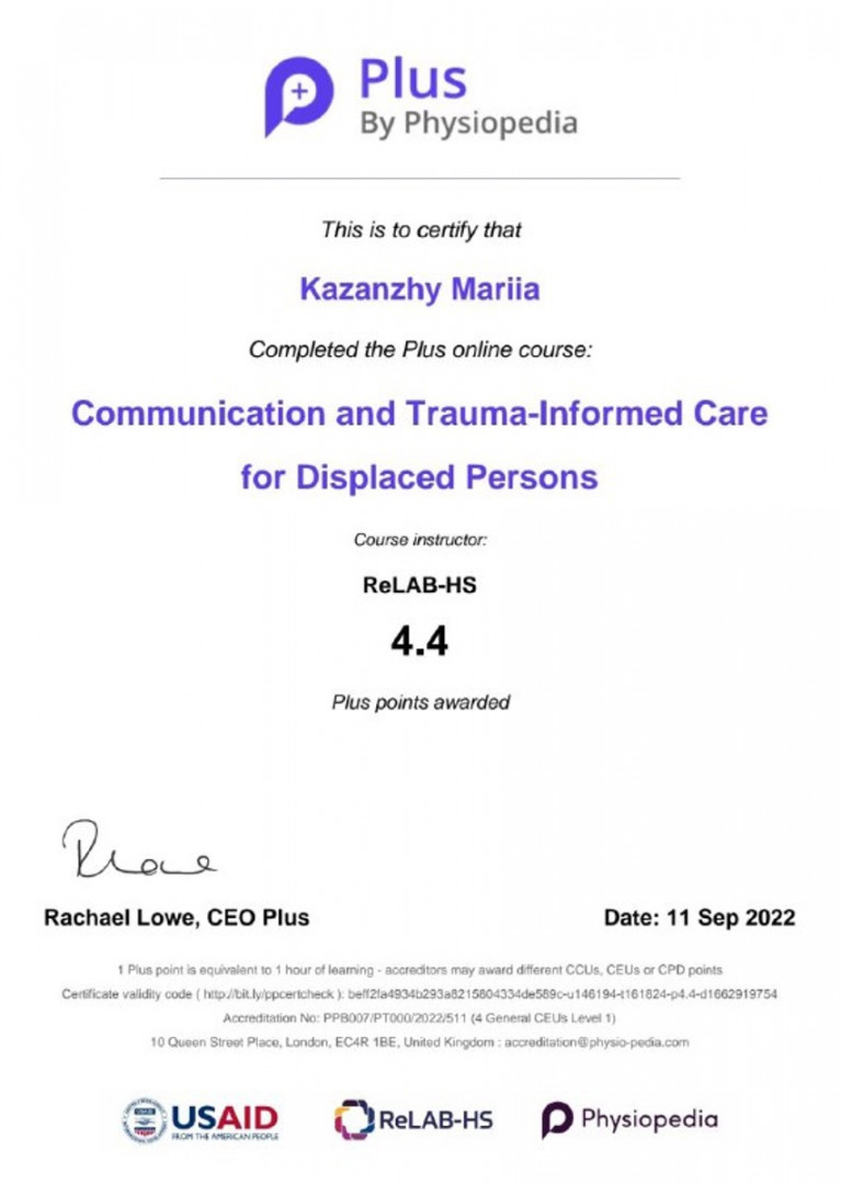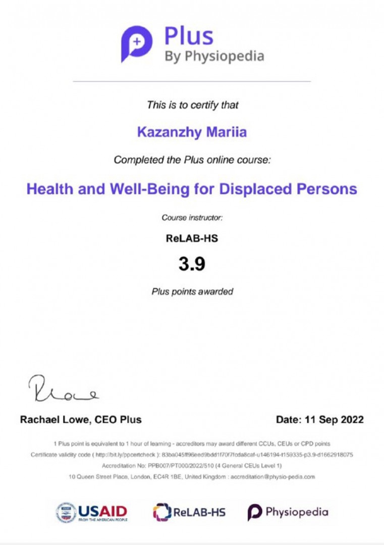 Члени робочої групи ОНП Психологія проф. Казанжи М.Й. та проф. Вдовіченко О.В. долучилися до програми «Розуміння реабілітаційних потреб переміщених осіб».Ця програма спрямована на озброєння фахівців всебічними знаннями про реабілітацію переміщених осіб. До 11 вересня 2022 року було пройдено три модулі програми, що дає змогу зрозуміти як задовольнити потреби біженців та переміщених осіб на кожному етапі міграційного процесу. Отримано знання щодо специфіки комунікації в реабілітаційному процесі, створення терапевтичного альянсу, довірливого терапевтичного простору, допомоги переміщеним особам з урахуванням травми; підходи, які зменшують вплив травми та вирішують труднощі людини, що пов’язані з травмою та психосоціальними проблемами тощо.