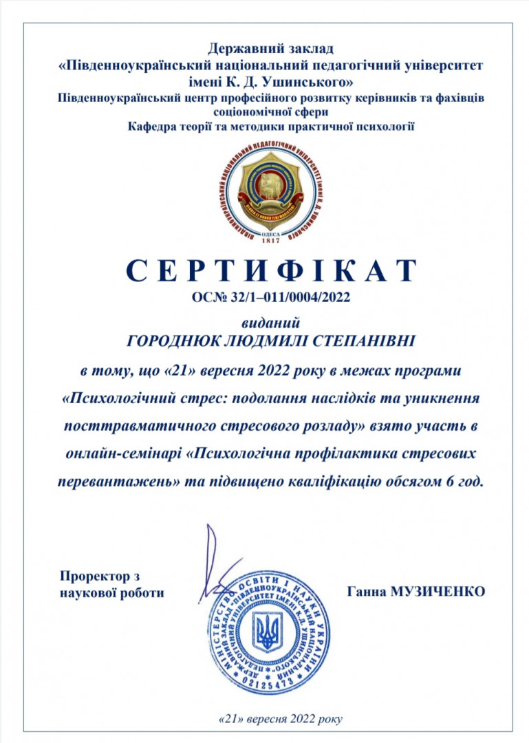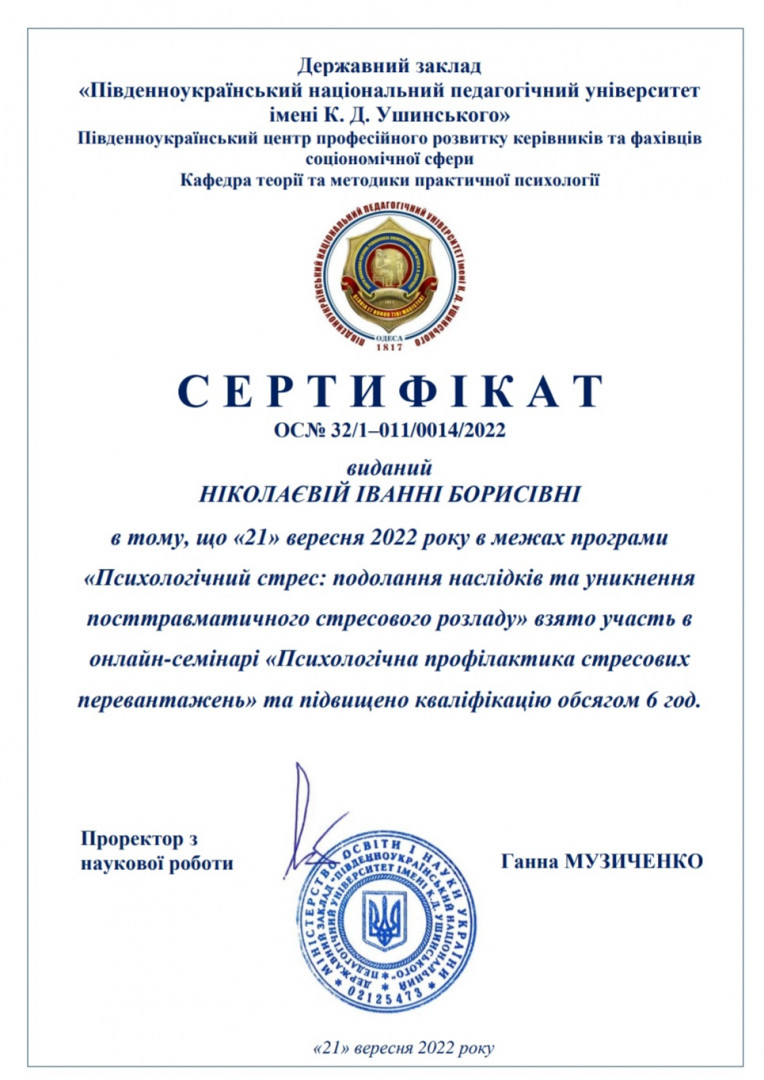 21 вересня 2022 року на базі Південноукраїнського центру професійного розвитку керівників та фахівців соціономічної сфери Університету Ушинського відбулося підвищення кваліфікації за програмою «Психологічний стрес: подолання наслідків та уникнення посттравматичного стресового розладу» для молодих вчених та здобувачів вищої освіти, головна мета якого - набуття нових знань та навичок у сфері психологічної підтримки учасників освітнього процесу під час навчання та у повсякденному житті
