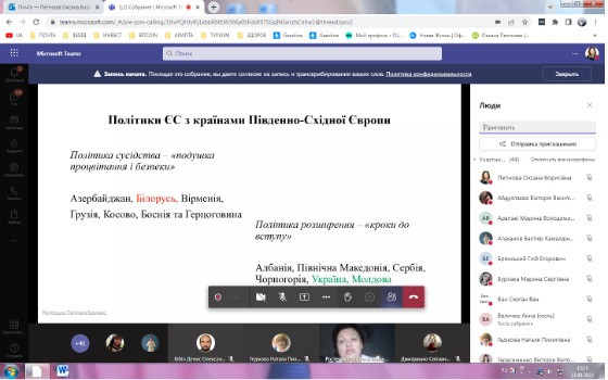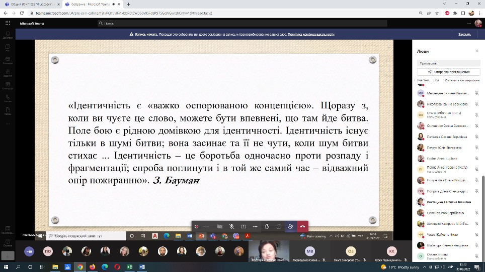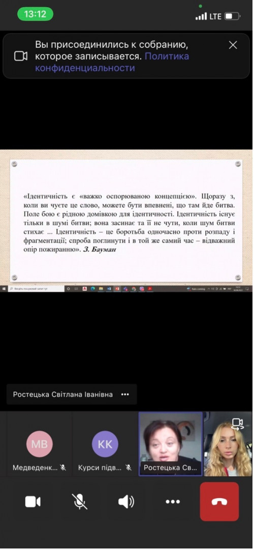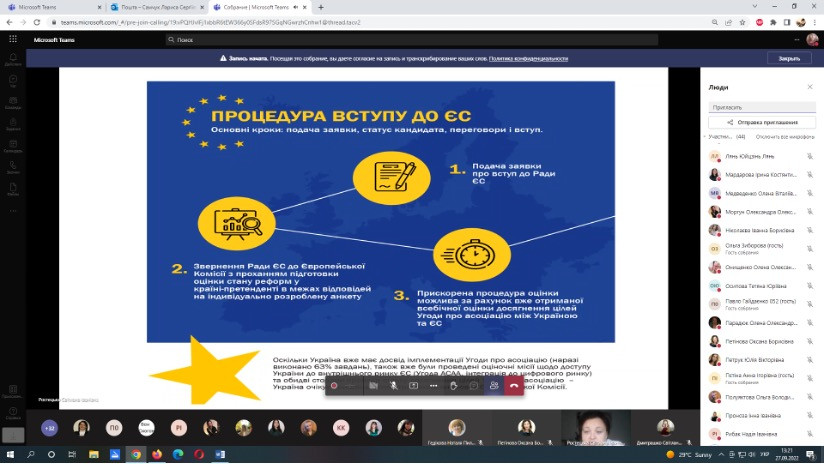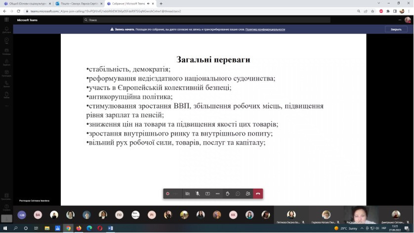 27 та 30 вересня 2022 року науково-педагогічні працівники кафедри філософії, соціології та менеджменту соціокультурної діяльності (проф. Оксана Петінова, викл. Лариса Самчук), аспіранти ОНП Філософія (Олена Парадюк, Іванна Ніколаєва, Марина Арапакі, Людмила Городнюк, Віолета Світлицька, Ігор Семенов), здобувачі вищої освіти ОПП Культурологія та ОПП Менеджмент соціокультурної діяльності за першим (бакалаврським) рівнем (Крістіна Данильчук, Ніколь Гавриш, Надія Ладан, Євгенія Шабатура, Яна Грицак, Валерія В’язова) узяли участь у корпоративному навчанні на базі Південноукраїнського центру керівників та фахівців соціономічної сфери (керівник – проф. Наталія ЧЕРНЕНКО) за програмою «Статус кандидата на вступ до ЄС: виклики та можливості для України» й «Національна ідентичність та європейська інтеграція». Спікер – доктор політичних наук, доцент кафедри політичних наук і права Університету Ушинського Світлана Ростецька. Під час онлайн-семінарів усі присутні ознайомились з процедурою, перевагами та недоліками вступу до ЄС для України, обговорили важливість цього кроку для українського суспільства. Щиро вдячні організаторам за підготовку семінару щодо таких актуальних для України питань.